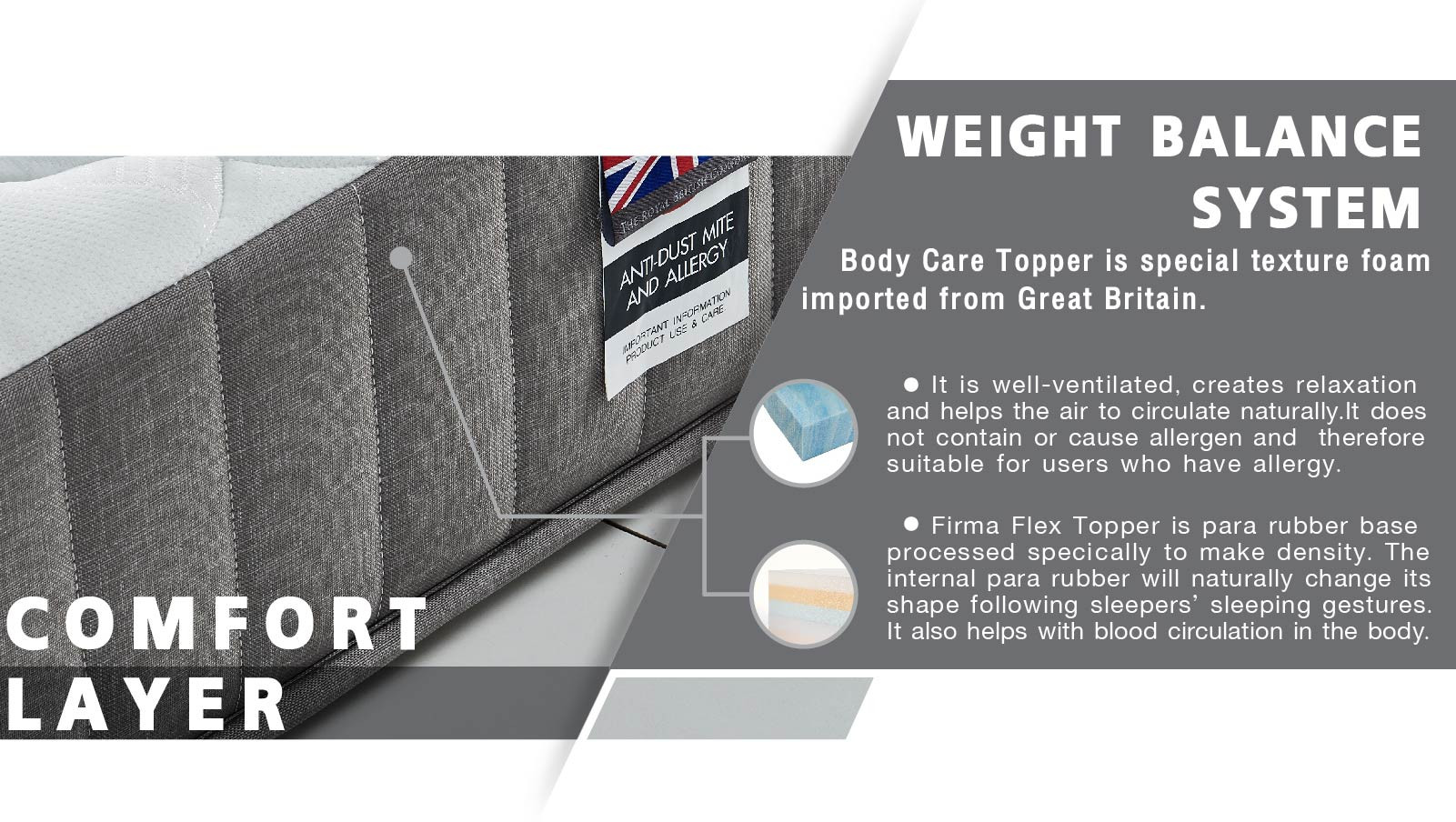 Body Care Topper is special texture foam imported from Great Britain. It has high density and is well- ventilated. You will feel relaxed and comfortable as the air can ventilate freely. It does not contain or cause allergen and therefore suitable for users who have allergy.