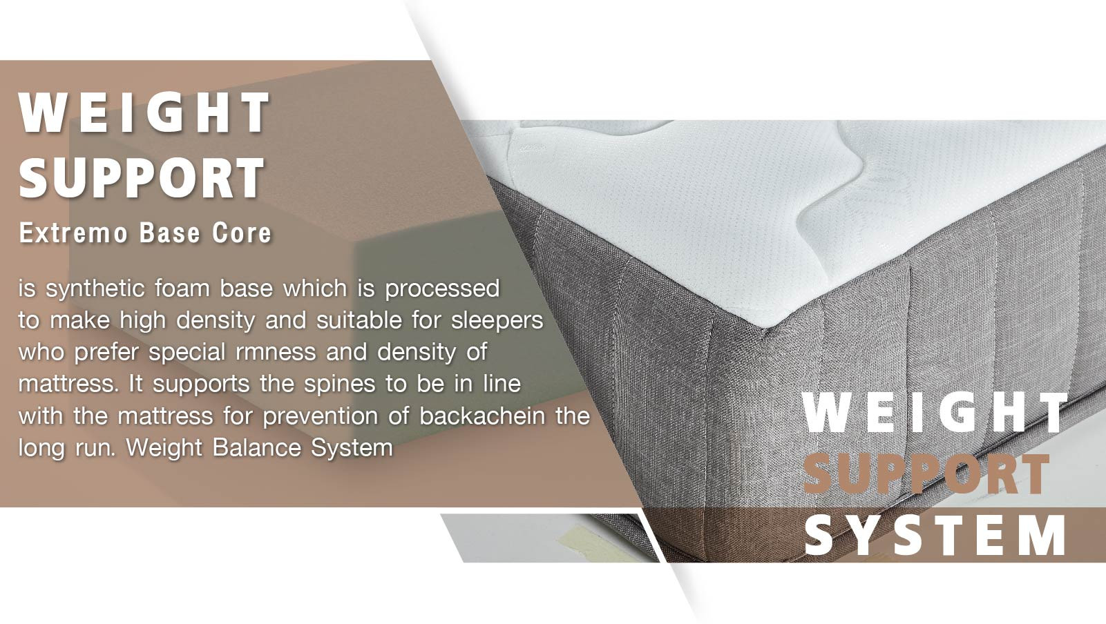 Extremo Base Core is synthetic foam base which is processed to make high density and suitable for sleepers who prefer special firmness and density of mattress.