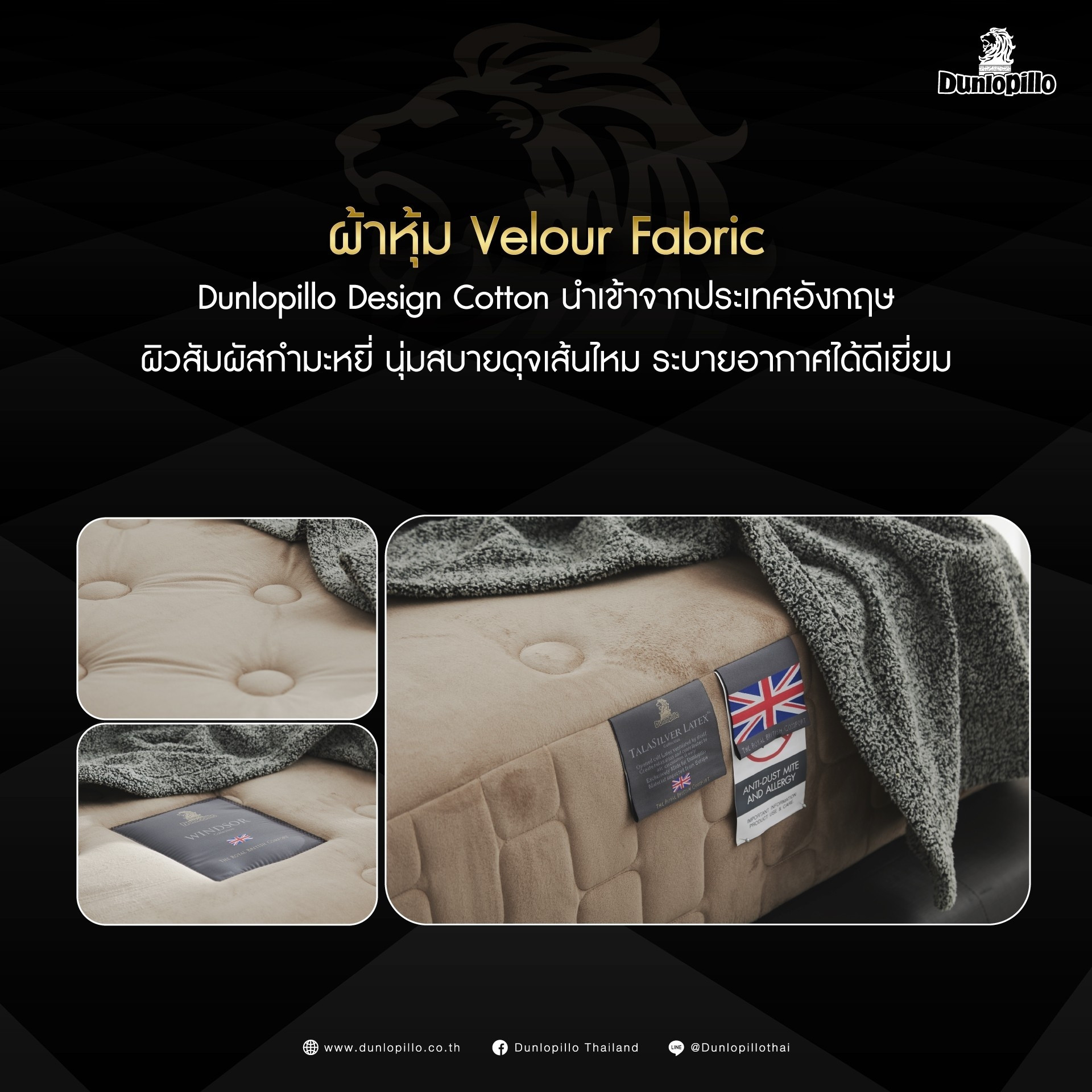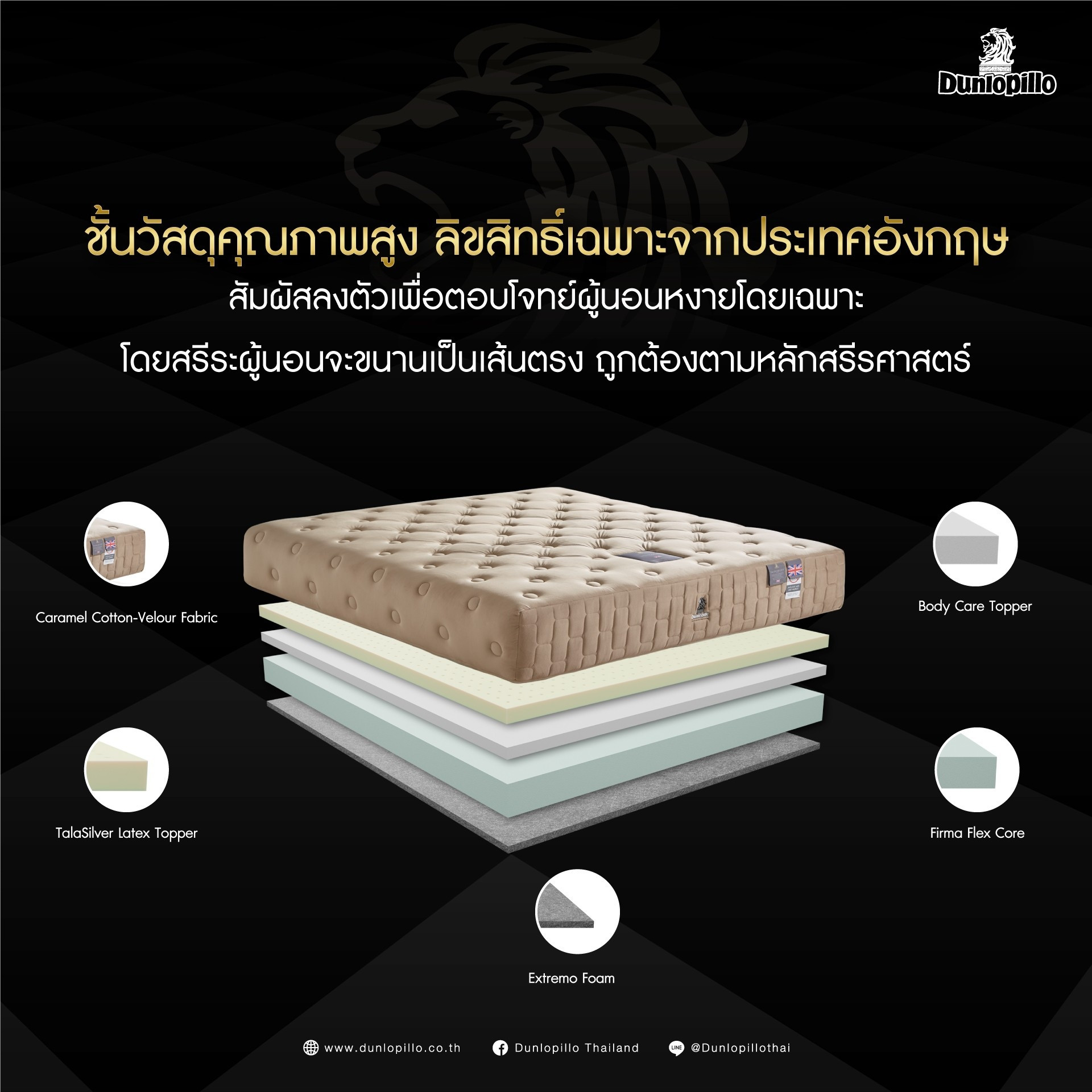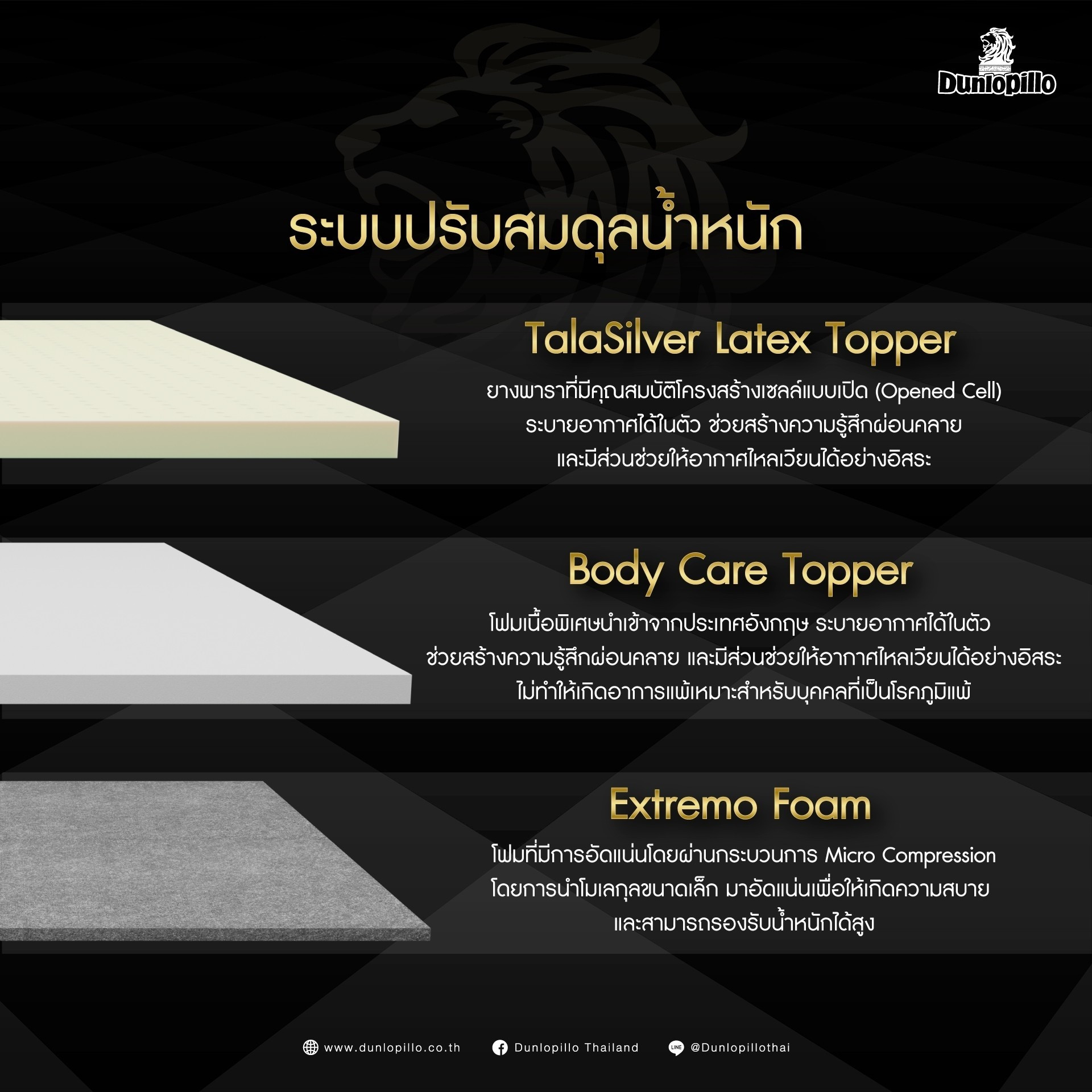 Dunlopillo (Thailand) is one of the leading mattress manufacturers, importers and exporters in the bedding industry. Originally established in the United Kingdom with British quality, Dunlopillo has been in the market of mattresses for over 100 years and recognized by consumers all over the world.