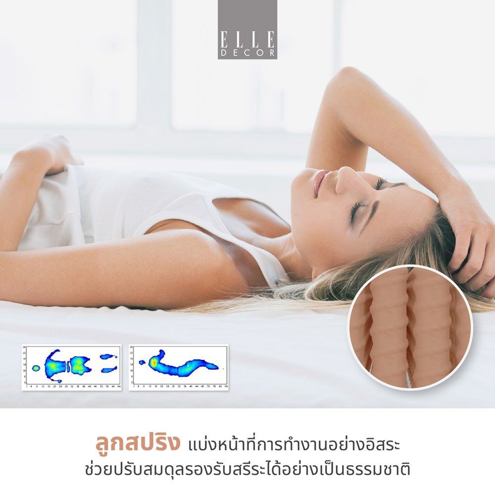 Elle Free-Coils : ระบบสปริงอิสระลิขสิทธ์เฉพาะจากประเทศฝรั่งเศส ลูกสปริงแต่ละลูกแบ่งหน้าที่การทำงานอย่างอิสระ ช่วยปรับสมดุลรองรับสรีระได้อย่างเป็นธรรมชาติ รองรับน้ำหนักได้อย่างสมบูรณ์แบบ ป้องกันการสั่นเคลื่อนไหวรบกวนจากการพลิกตัวของคู่นอนได้อย่างมีประสิทธิภาพ
