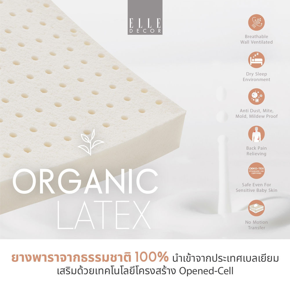 Organic Latex : น้ำยางพารา 100% จากธรรมชาติ ผ่านกระบวนการเทคโนโลยีการผลิตที่ล้ำสมัย สร้างโมเลกุลของเนื้อโฟมยางพาราให้มีโครงสร้างแบบ Opened Cell ทำให้เกิดรูพรุนเล็กๆคล้ายรวงผึ้งจากประเทศเบลเยี่ยม ช่วยเพิ่มประสิทธิภาพให้ระบบการหมุนเวียนอากาศภายในเนื้อโฟมยางพารา ปรับสมดุลของอุณหภูมิให้เหมาะสมกับร่างกายจึงให้ความรู้สึกเย็นเมื่อได้สัมผัส กลิ่นหอมอ่อนๆ จากยางพาราธรรมชาติช่วยสร้างความสงบในการพักผ่อน ปราศจากแบคทีเรียและไรฝุ่นที่ก่อกวนต้นเหตุของโรคภูมิแพ้ อีกทั้งยังมอบประสบการณ์ความรู้สึกของการรองรับสรีระร่างกายที่สมบูรณ์แบบจัดแนวกระดูกสันหลังให้ถูกต้องตามสรีระศาสตร์ ดุจดั่งสัมผัสจากธรรมชาติที่โอบกอดร่างกายให้ผ่อนคลายในทุกค่ำคืน