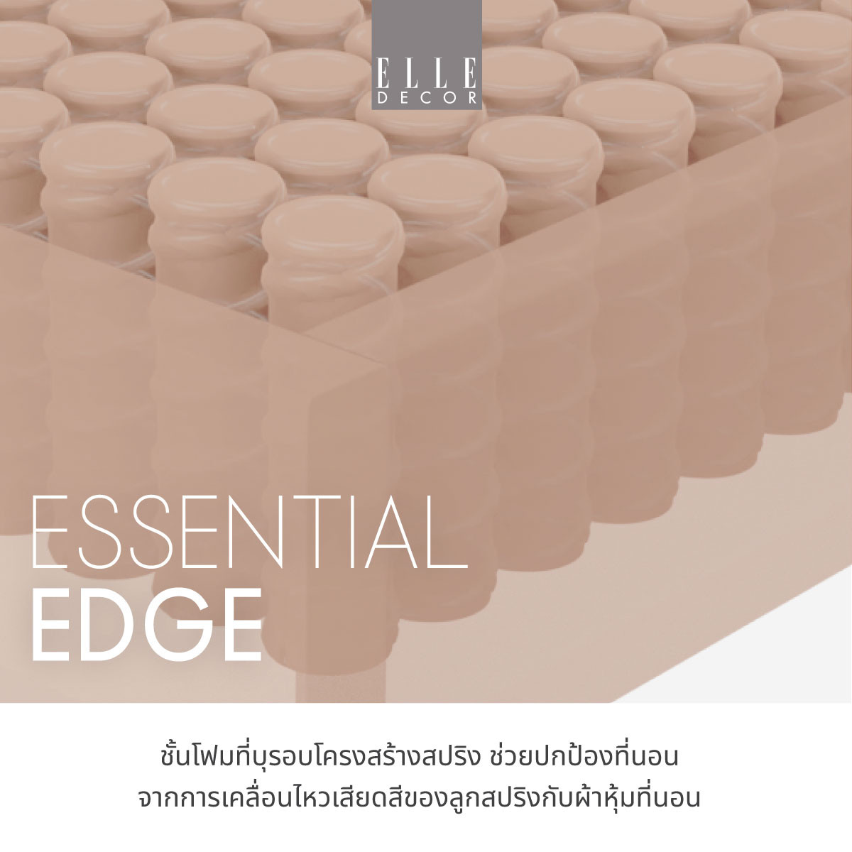 Essential Edge : โฟม Elle HD Performance Foam ที่ถูกบุรอบขอบของโครงสร้างสปริง ทำหน้าที่ช่วยปกป้องที่นอน จากการเคลื่อนไหวเสียดสีของลูกสปริงกับผ้าหุ้มที่นอน ซึ่งจะทำให้ขอบของผ้าหุ้มที่นอนฉีกขาดเสียหายได้ อีกทั้งยังป้องกันฝุ่นละออง และสิ่งสกปรกต่างๆไม่ให้สามารถเข้ามาภายในที่นอน ซึ่งเป็นอีกหนึ่งสาเหตุของการ เกิดไรฝุ่น พร้อมระบบระบายอากาศที่หมุนเวียนอย่างมีประสิทธิภาพในทุกค่ำคืนที่ล้มตัวลงนอน