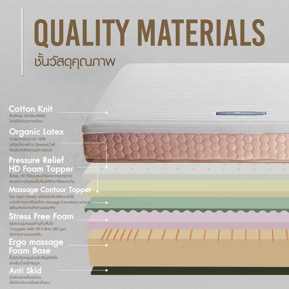 - The Ergo Massage Foam Base is a high-quality foam material utilizing the innovative Zoned Comfort technology. This design smoothens the surface to resemble the unique texture of durian spikes. The Convoluted feature aids in achieving balance, efficiently distributing weight, and adjusting the spine alignment to be parallel with the mattress surface, and instantly offering comfort as soon as you lie down.