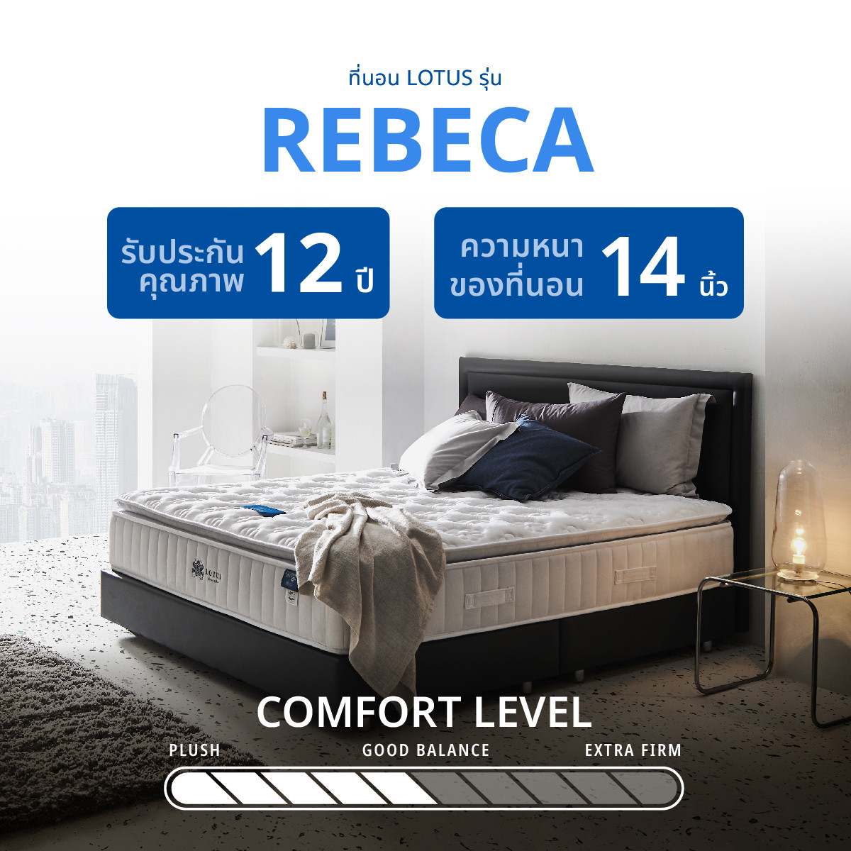 The good balance Rebeca series is crafted ideally for lovers of progressive comfort. With a better overall weight redistribution and strengthened stability, your spine is sublimely aligned, resulting in relieved stress points and reduced body pressure. Precisely designed and perfectly refined for your memorable night after night, the Rebeca is your excellent choice for your profound sleep.