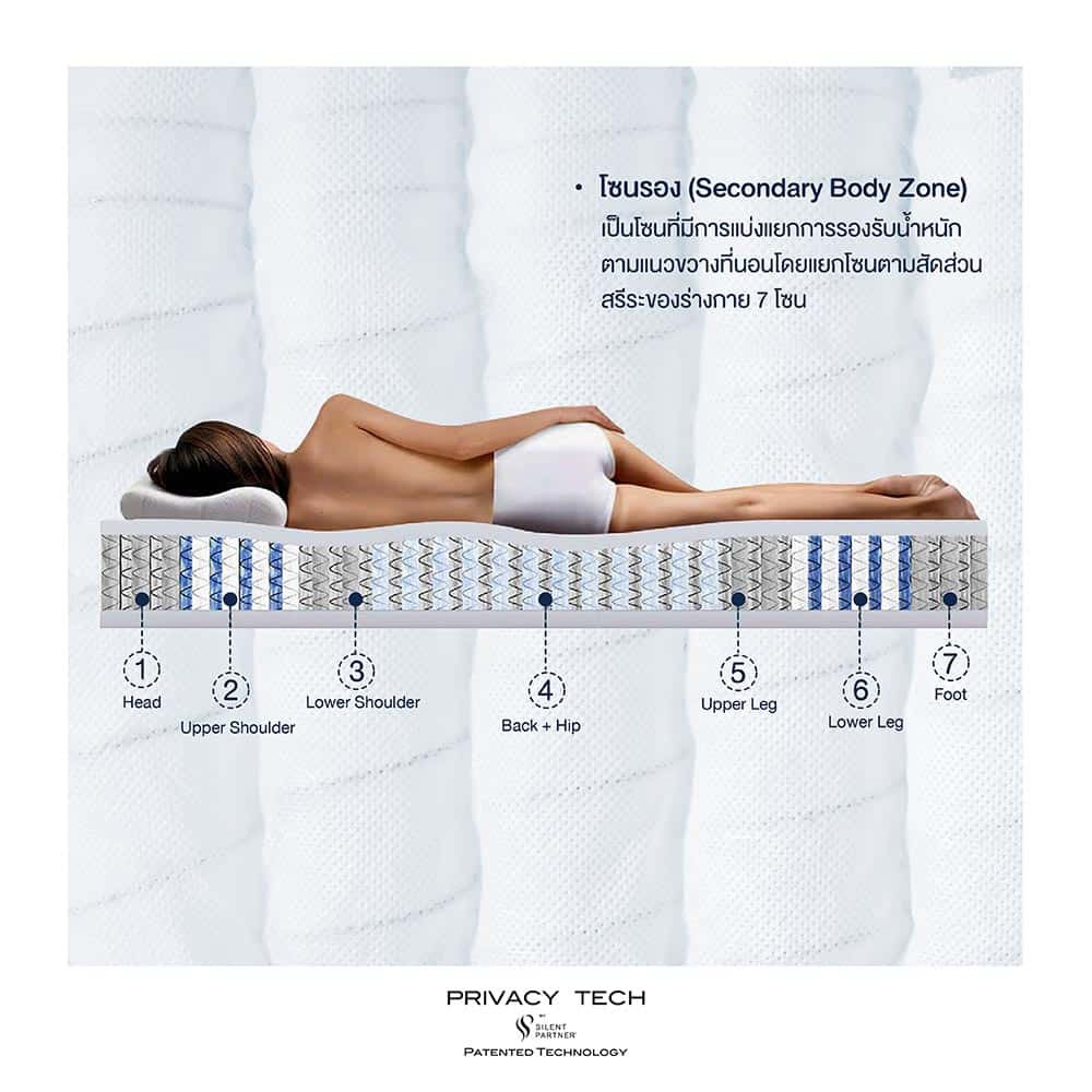 Secondary body zone is divided into 7 horizontal zoning, each zone provides distinct firmness level, more pressure relieving support added in the hip and shoulder areas through innovative Up/Down pocketed coil system and relaxing comfort in the leg and head areas through slightly firmer yet supportive pocketed system zoning.