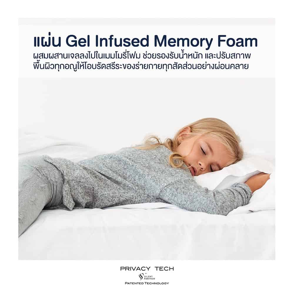 Gel Infused Memory Foam offers body conforming support with cooling gel that absorbs body heat from surrounding memory cells. Only Gel Infused Memory Foam features unique airflow channels that provide exceptional ventilation, allowing heat to escape so you stay cool and dry all night long.