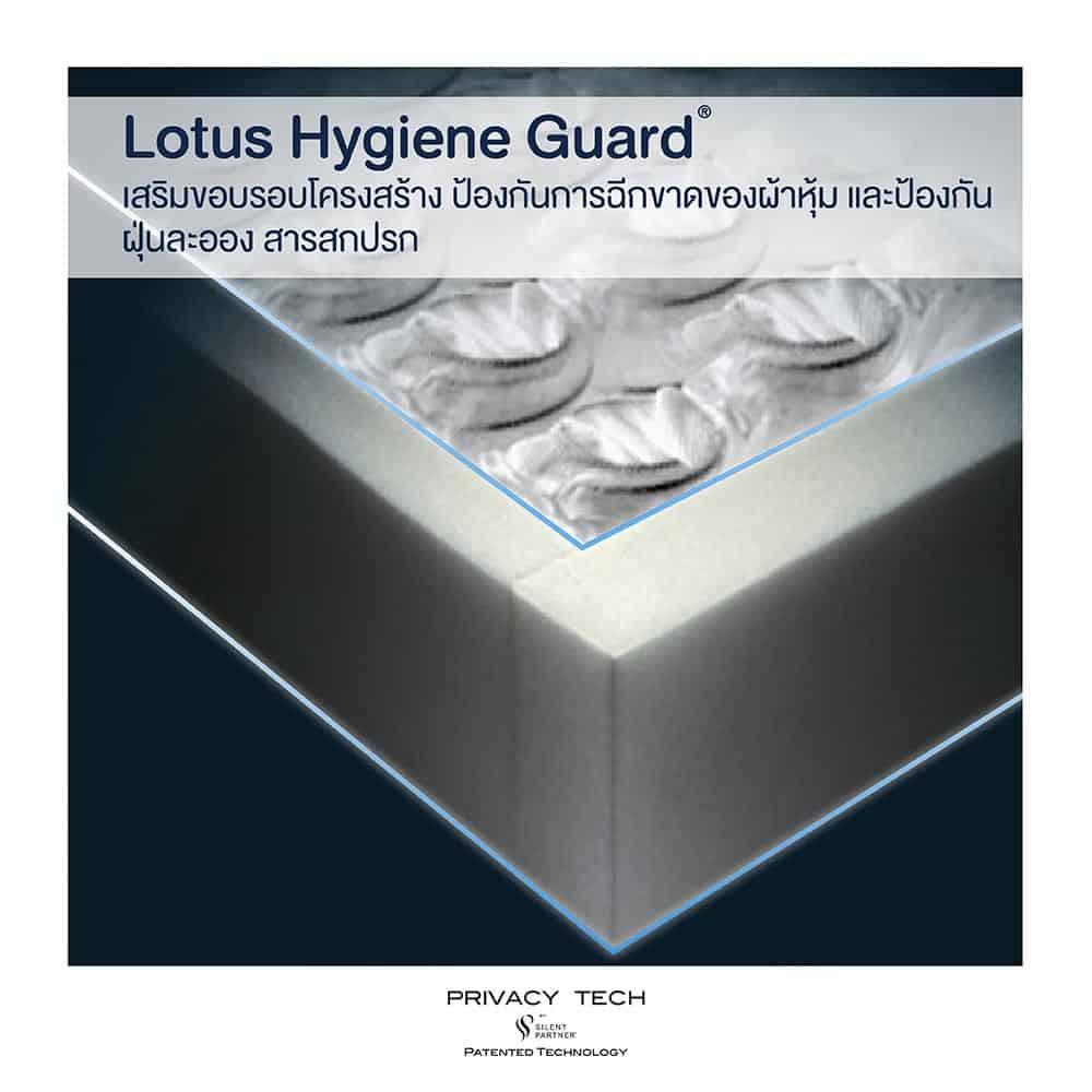 LOTUS HYGIENE GUARD® surrounds the inner spring coil for soft-touch border and hygiene protection, while safeguarding the mattress from unwanted particle to enter into layers of the mattress, which leads to inhabitant of dust mites and allergens. Another special care from us.