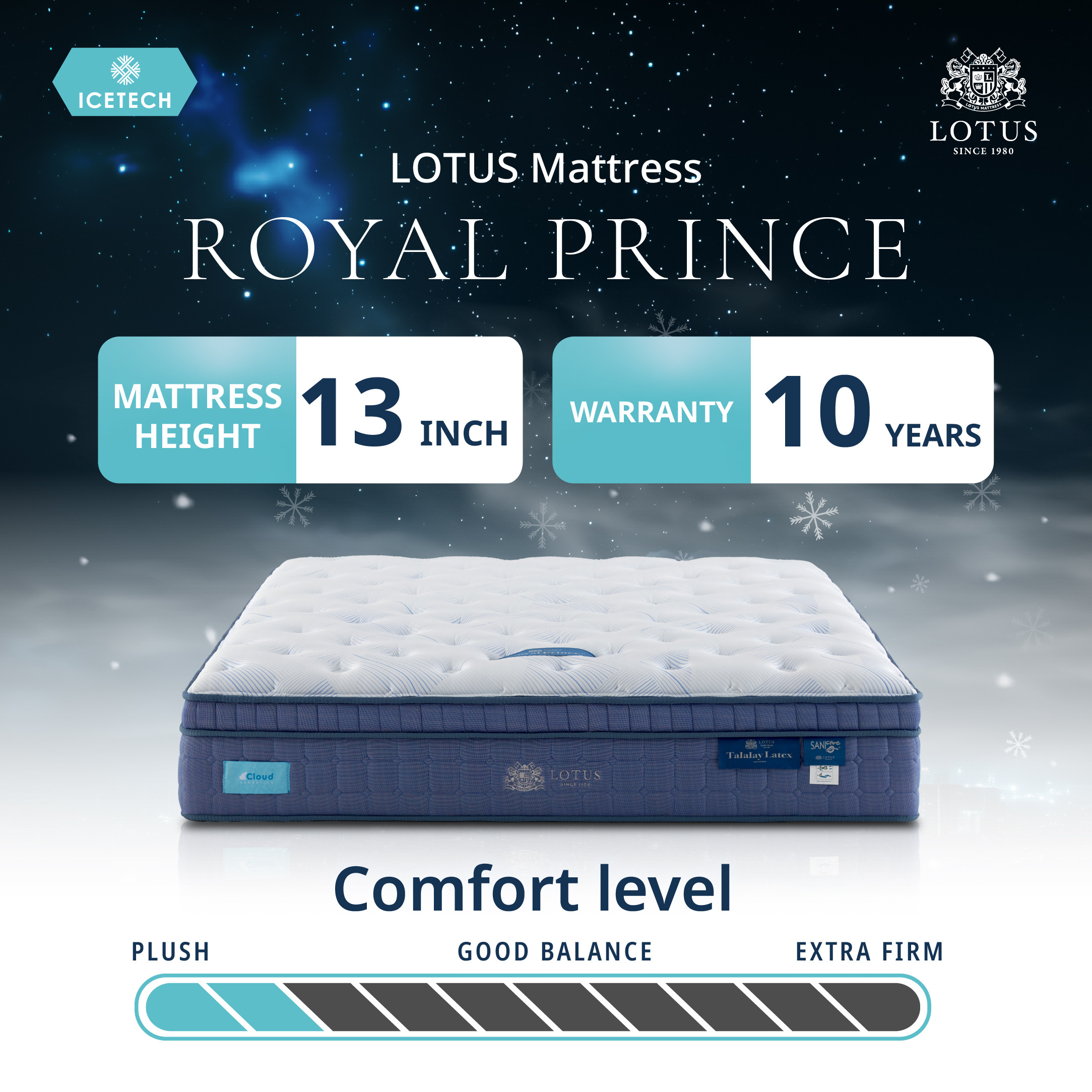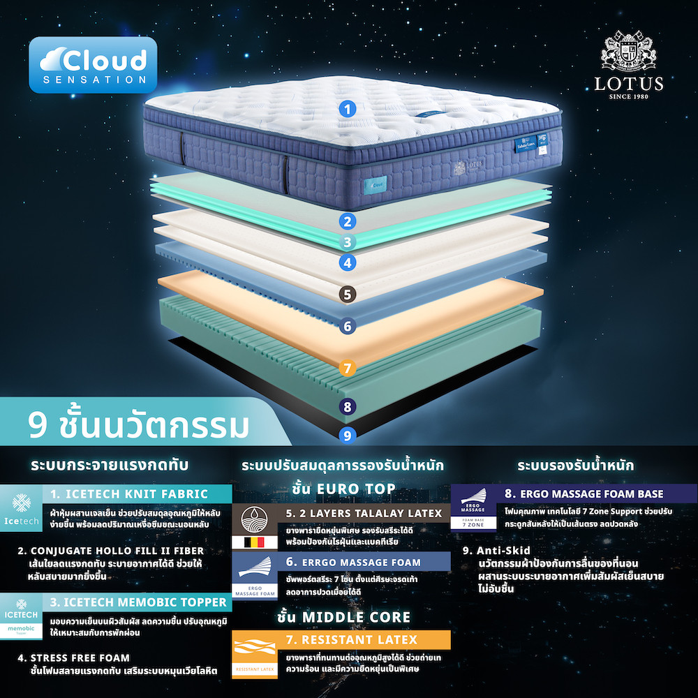 Step into the realm of serenity with The LOTUS Royal Prince, designed to cradle you in cool, cloud-like comfort by the advanced Cloud Sensation system that transforms each night into a gentle escape, while the Ergo Massage Foam Base help to support your body, featuring a grooved surface design combined with advanced 7-Zone Support technology. This system provides pressure relief from head to toe while delivering enhanced back support for optimal spinal alignment.