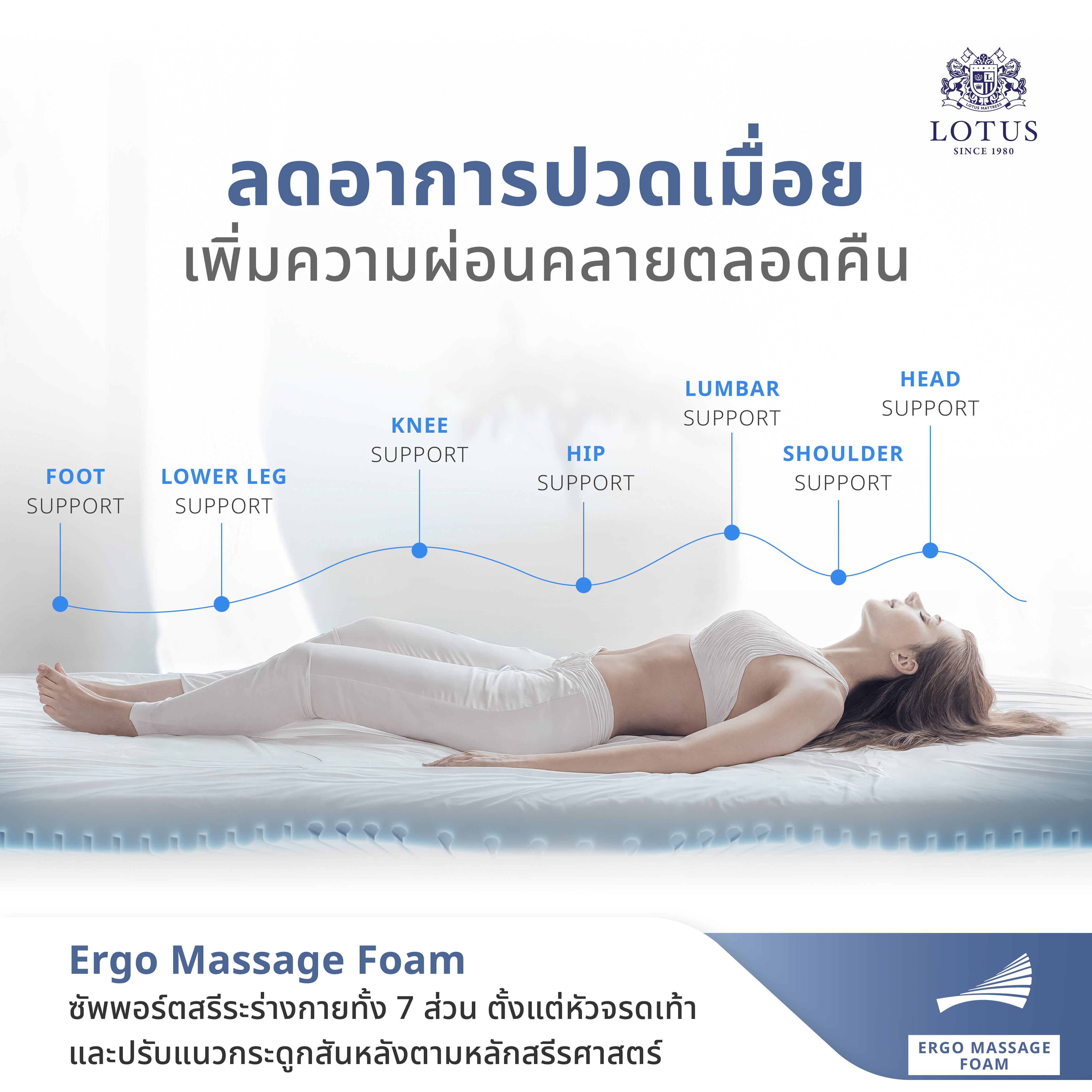 - Ergo Massage Foam, an innovative foam layer with a grooved surface design, ergonomically engineered to support all 7 body zones. It promotes proper spinal alignment and helps relieve pressure in critical areas, reducing body aches. Enjoy full back relaxation and deep comfort all night long.