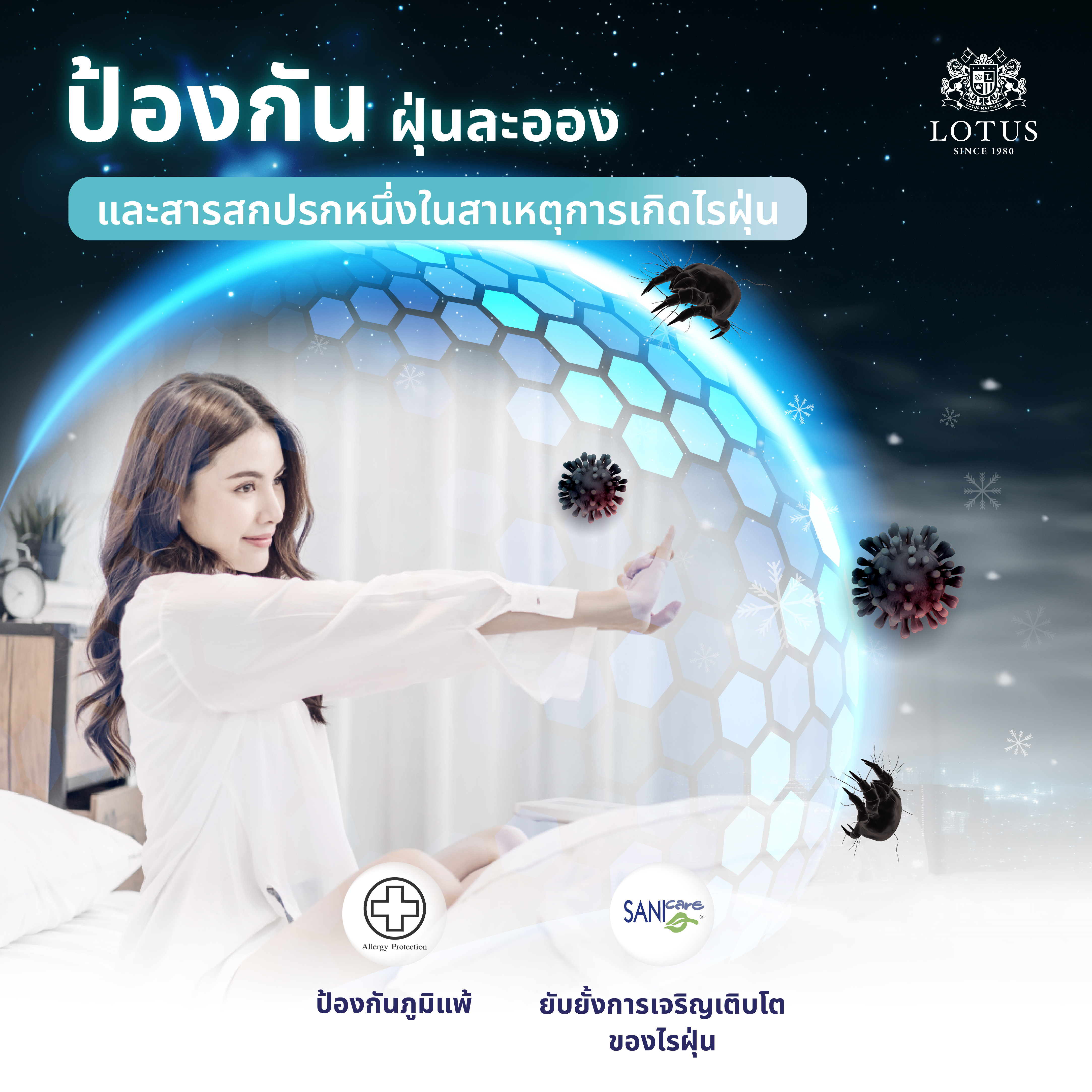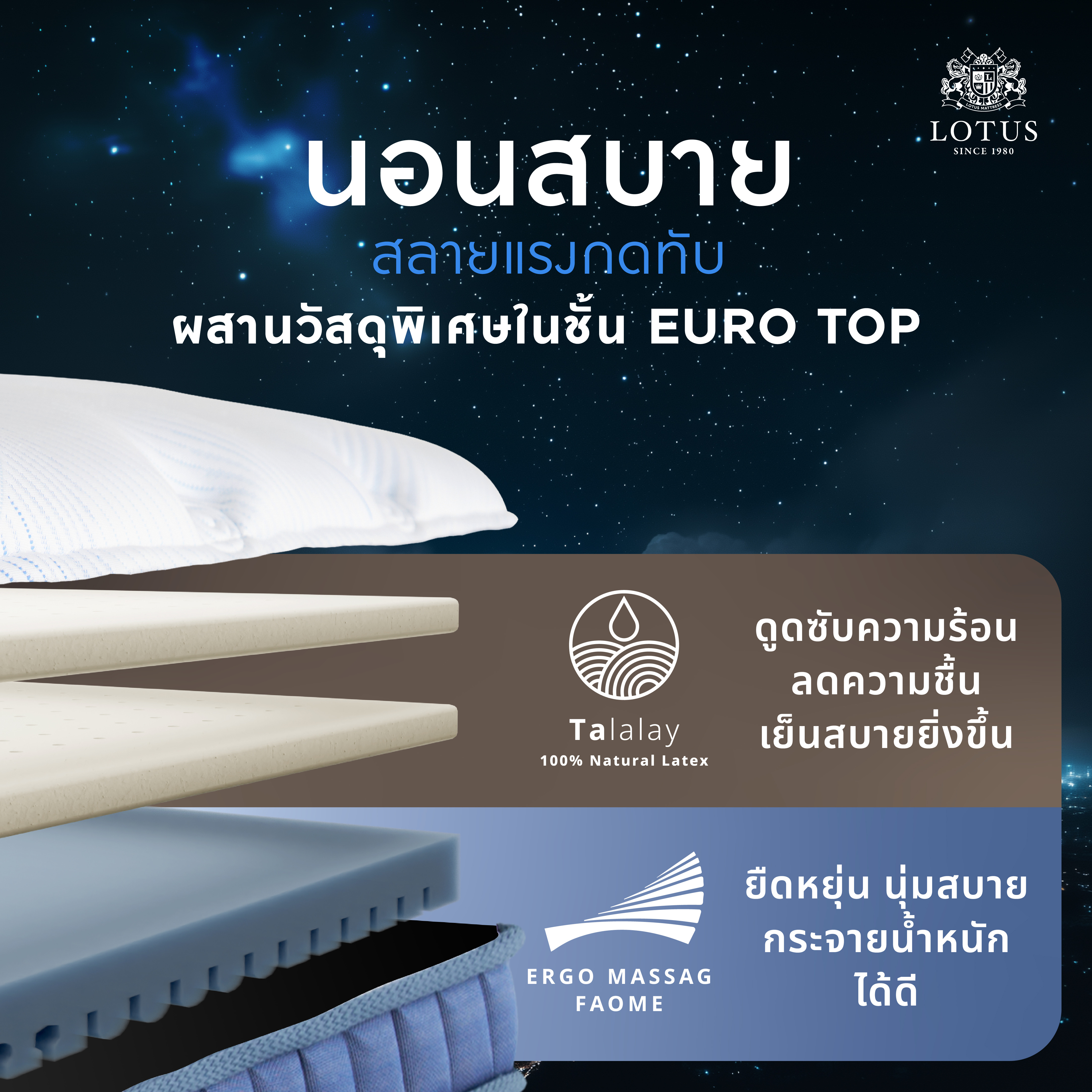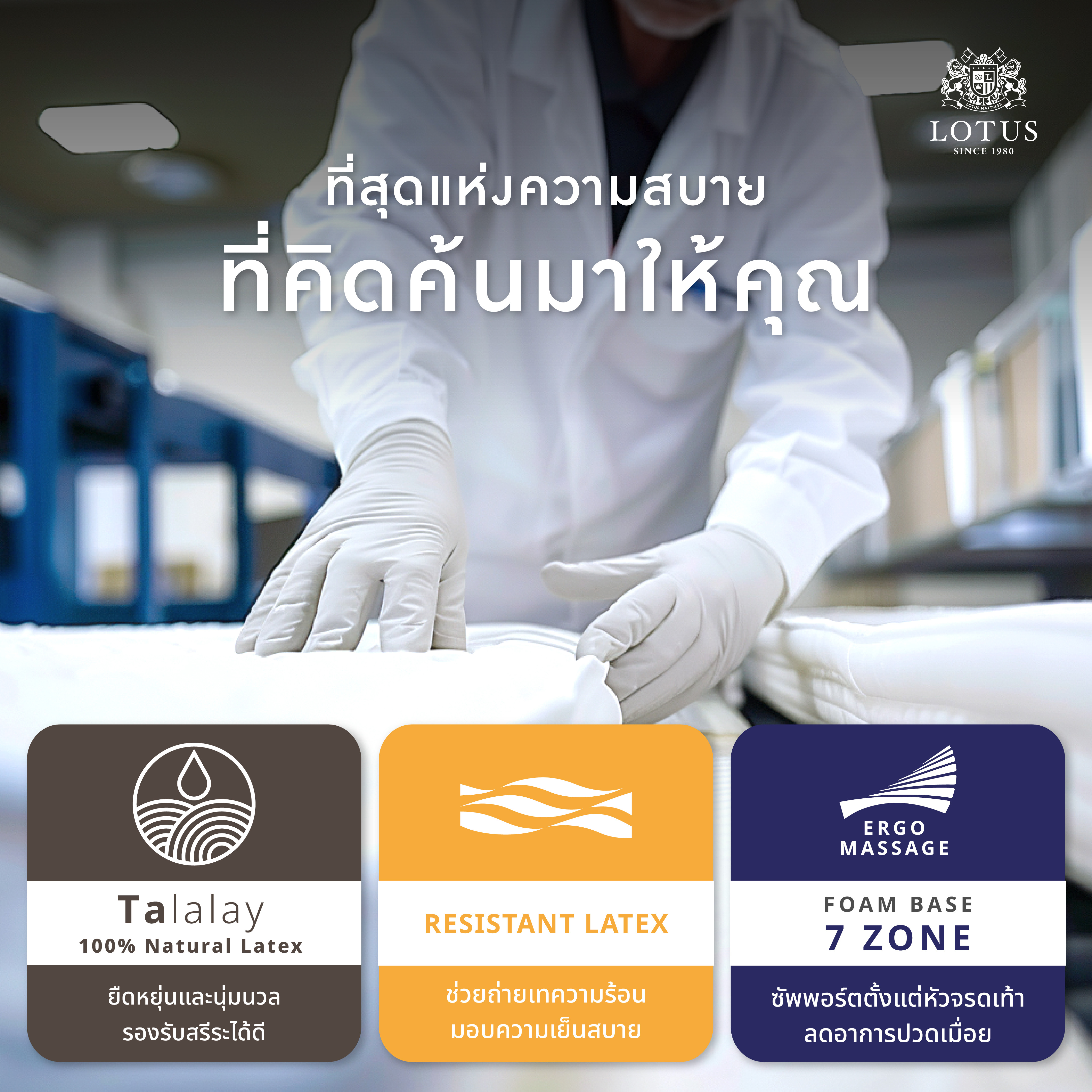 Elevate your comfort with Talalay Latex, offers superior elasticity and a delicately soft touch. Designed to contour perfectly to your body, promoting ergonomic support and pressure relief throughout the night. Additionally, its antibacterial and dust mite-resistant properties help reduce allergy risks, ensuring a cleaner and healthier sleep environment. Advanced Support with Resistant Latex, an exclusive latex innovation by LOTUS, designed to deliver superior pressure relief and relaxing feel every time you lie down. With greater elasticity than natural latex, it conforms more effectively to the body while also offering excellent resistance to high temperatures for added safety.