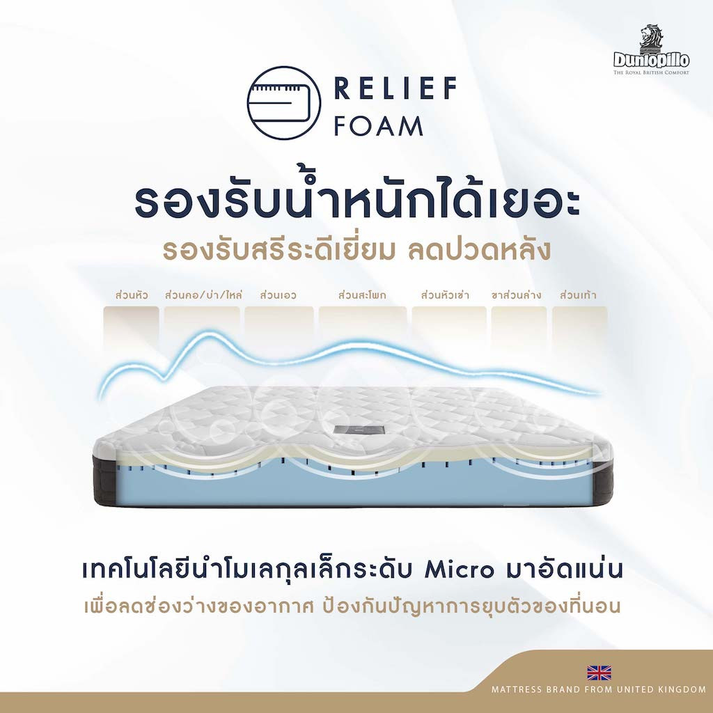Relief Foam ฐานโฟมคุณภาพสูงที่ผ่านการอัดแน่นด้วยเทคโนโลยี Micro Compression โดยการนำโมเลกุลเล็กๆ ระดับ Micro มาอัดแน่นเพื่อลดช่องว่างของอากาศ ป้องกันปัญหาการยุบตัวของที่นอนและ สามารถรองรับน้ำหนักได้อย่างมีประสิทธิภาพ มาพร้อมระบบระบายอากาศภายในตัว สามารถถ่ายเทความร้อนจากภายในที่นอนได้อย่างสมบูรณ์แบบ