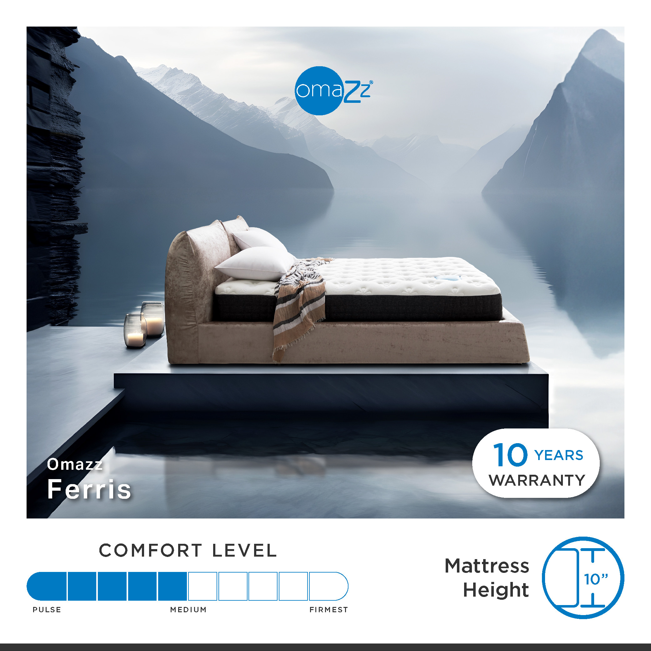 Experience the epitome of restful ease and tranquility with Ferris mattress by Omazz®. Ferris invites tranquility into your sleep sanctuary. The innovative dual-layer Talatech™ Latex Topper effectively relieves pressure.