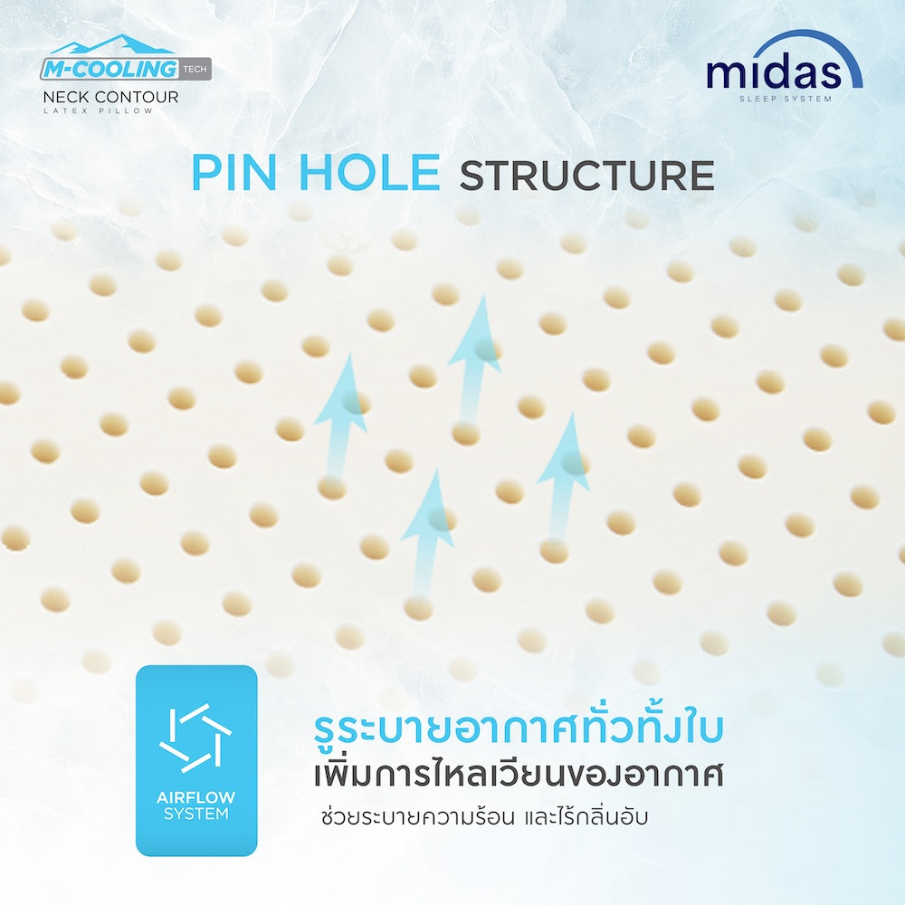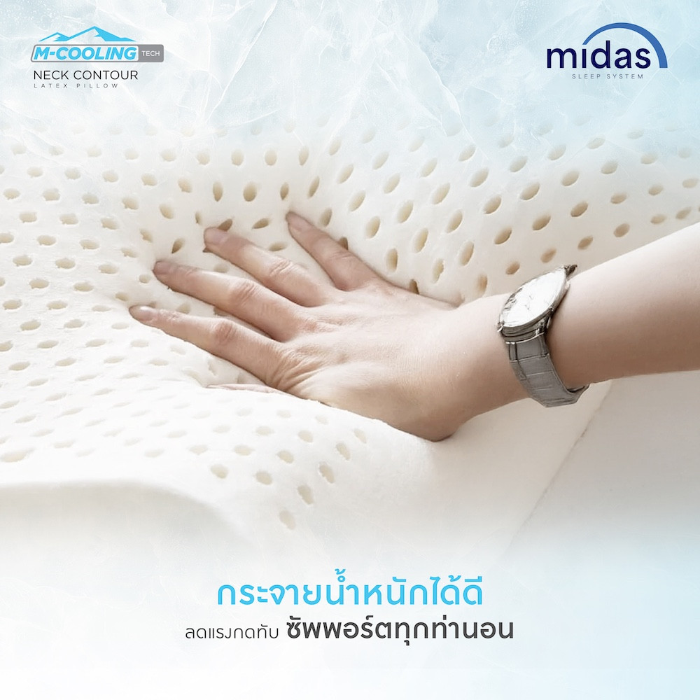 The Midas M-Cooling Neck Contour is made from highly flexible latex, providing stable weight support and shape retention. It features an open-cell structure for superior breathability to reduce heat and moisture, ensuring a clean, safe, and odor-free rest every night.