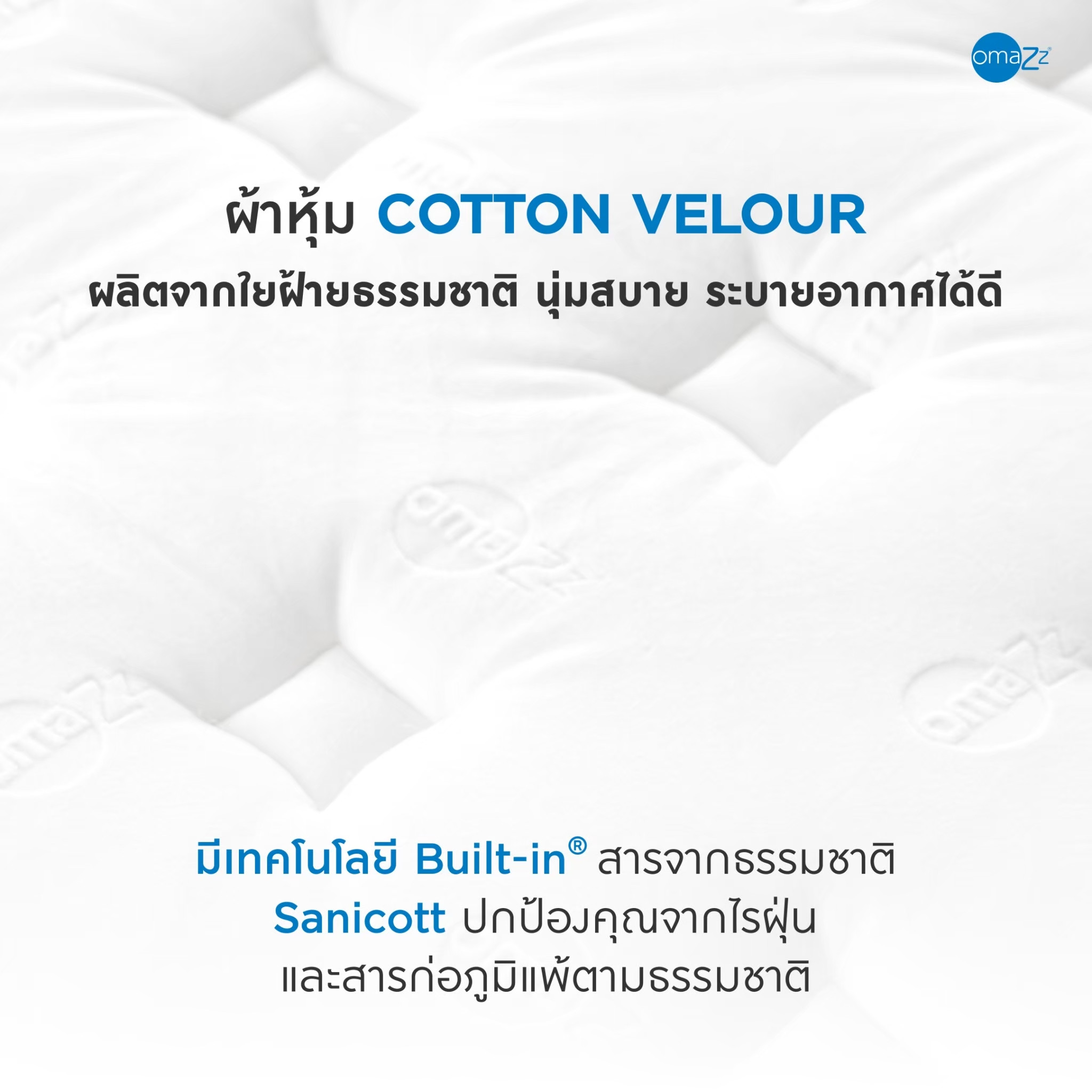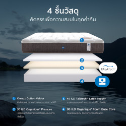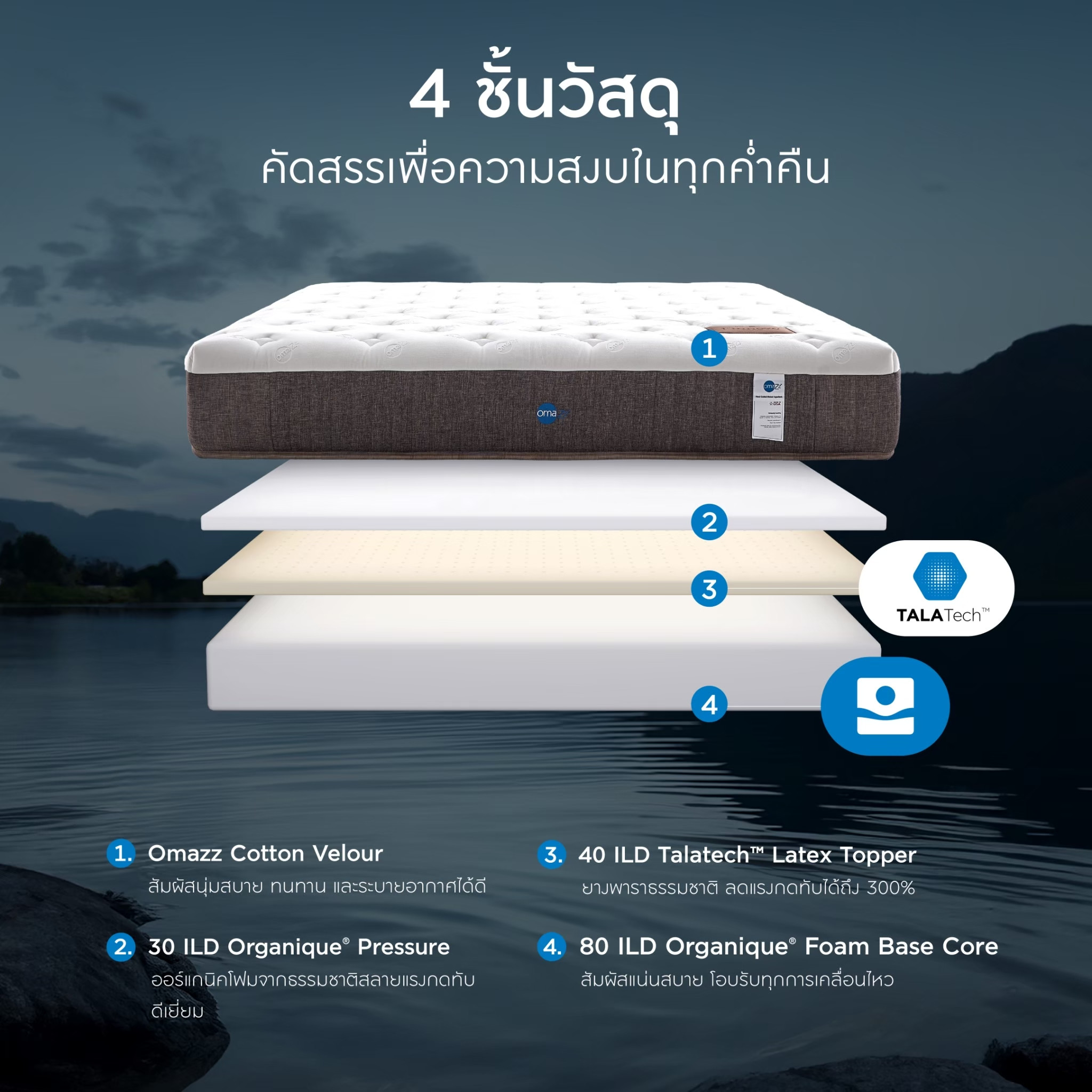 The Finnovo is a step up dream among Omazz® Mix Talatech™’s Collection. The remarkable weight balance and body support is further calibrated specifically for those who are fond of firmer support yet supreme pressure relieving comfort. The signature orthopedic-oriented mattress surface is upgraded to premium cotton-velour and exclusively hand-crafted to perfection embracing three layers of best natural-based components; vegetable extracted Organique foam base core, 36 ILD Premium Talatech™ Latex topper, and Organique Pressure-relieving Topper. Formulated with research and development by the hands of sleep lovers, The Finnovo lets you relax when you need it most.