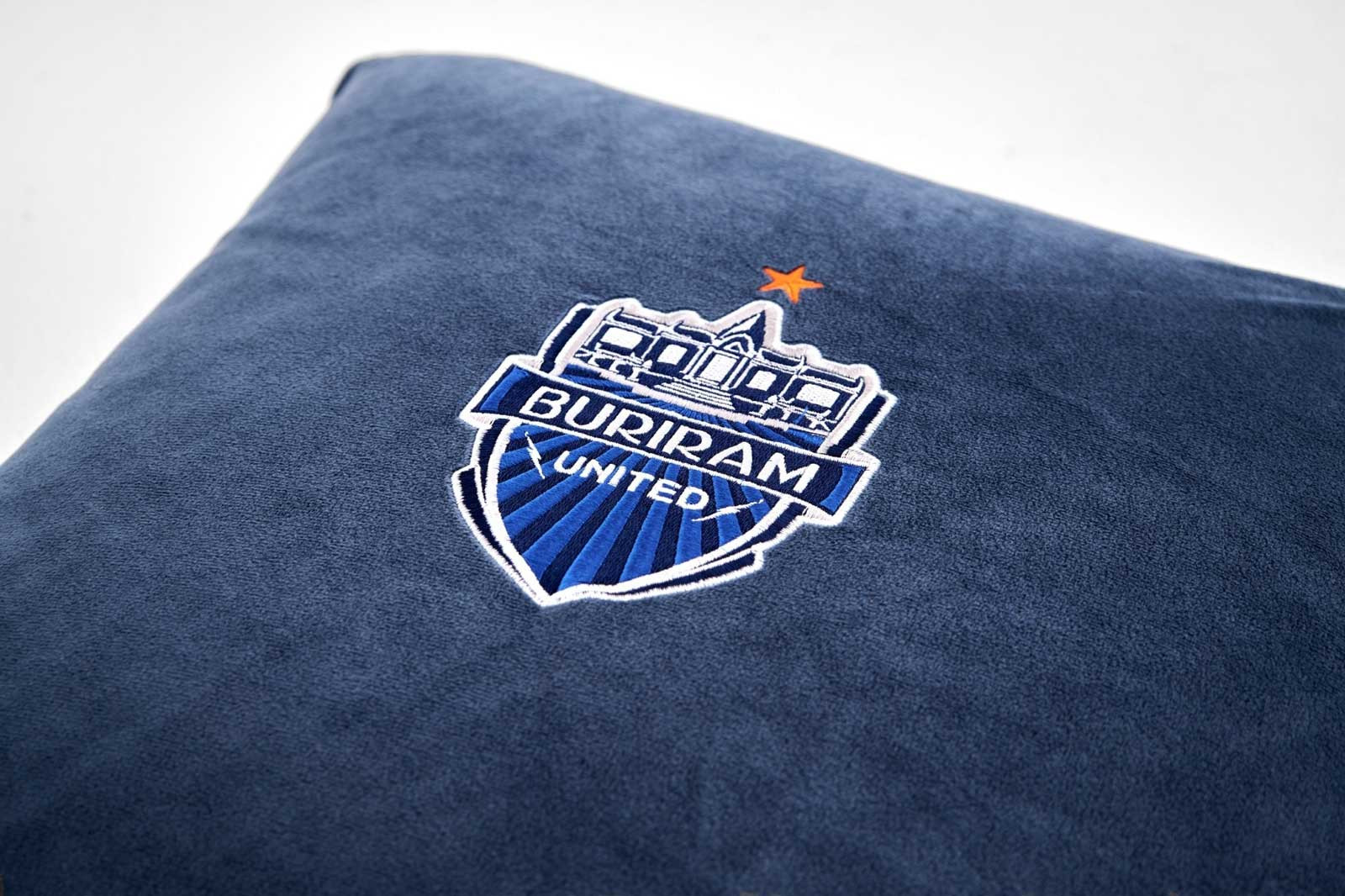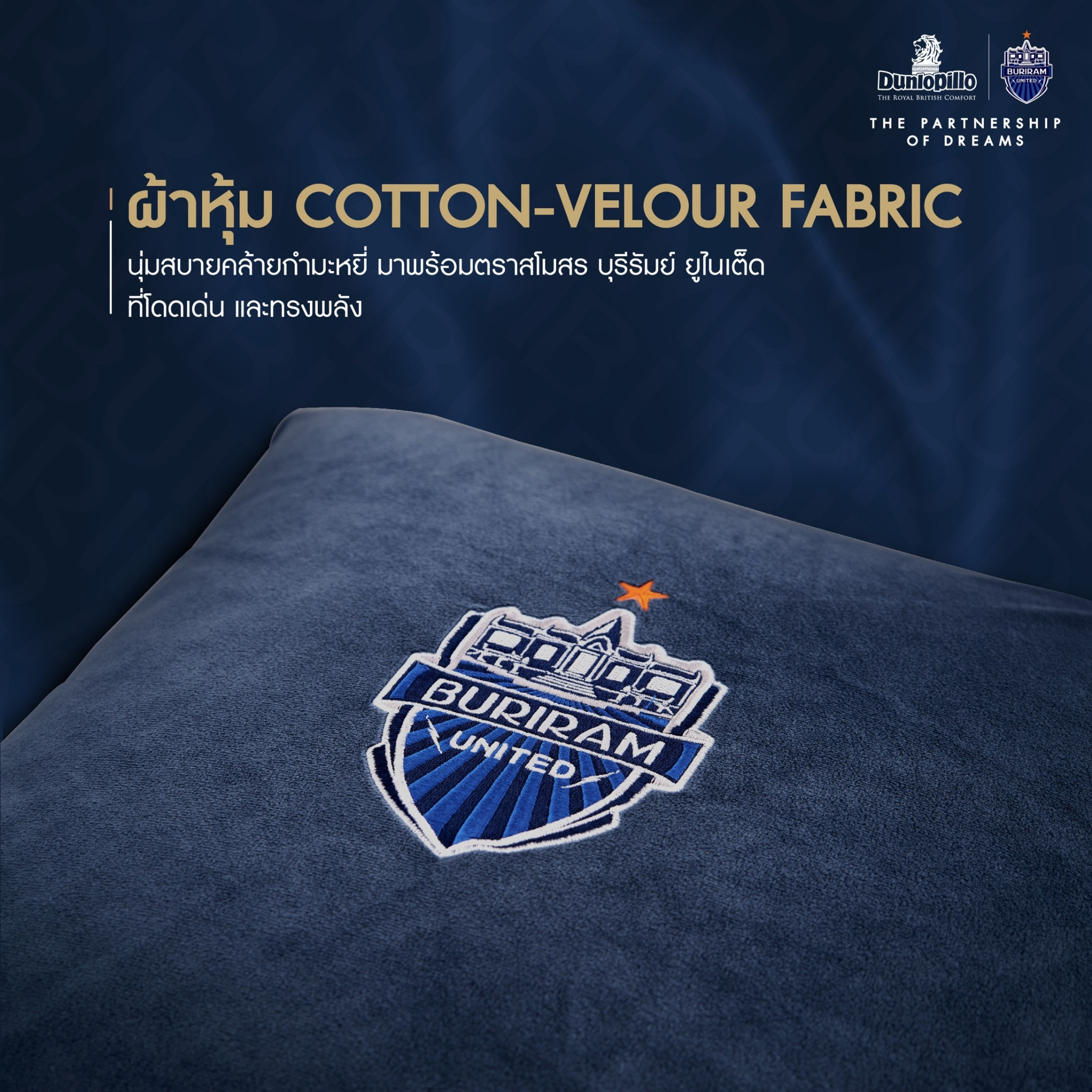 ผ้าหุ้ม Cotton-Velour fabric มอบสัมผัสนุ่มสบาย คล้ายกำมะหยี่ อ่อนโยนต่อสัมผัสและไม่ระคายเคืองผิว โทนสีน้ำเงินเข้มกับตราสโมสร “ปราสาทสายฟ้า” อันเป็นเอกลักษณ์ประจำทีมบุรีรัมย์ ยูไนเต็ด มาเป็นลวดลายโดดเด่นและทรงพลัง ให้ช่วงเวลาการพักผ่อนของคุณสัมผัสได้ถึงพลังอย่างเต็มเปี่ยม