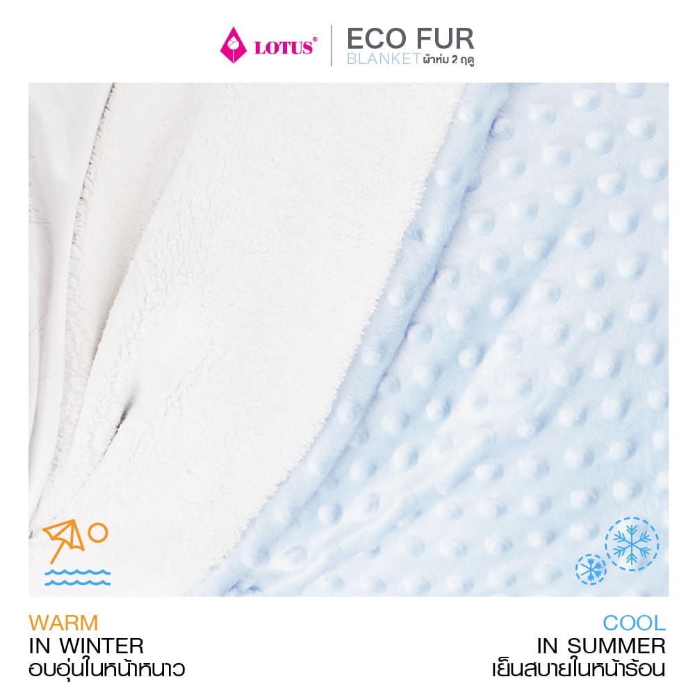 Eco-Fur ผ้าห่ม 2 ฤดู ที่ถูกออกแบบมาให้ใช้งานได้ทั้งสองฝั่ง ไม่ว่าจะหน้าร้อน หรือหน้าหนาว ผ้าห่มผืนเดียวก็เอาอยู่ อีกทั้งยังใช้วัสดุที่เป็นมิตรต่อสิ่งแวดล้อม ที่ให้ความรู้สึกคล้ายกับขนมิ้ง อบอุ่น อ่อนนุ่ม แต่ไม่มีไรฝุ่น ขนาด 60 x 80 นิ้ว