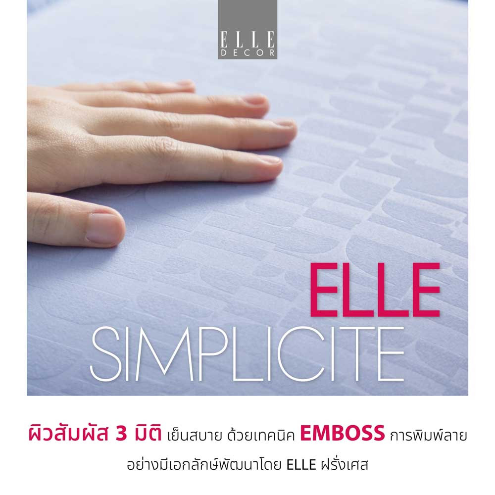 สัมผัสแรงบันดาลใจเพื่อการพักผ่อนกับ ท็อปเปอร์ ELLE Decor รุ่น Melissa ด้วยการผลิตด้วยเทคโนโลยีที่ทันสมัยเพื่อให้ได้เส้นใย Nano elle-fiber ที่ให้สัมผัสนุ่มสบาย พร้อมโครงสร้าง Opened-cell โครงสร้างเซลล์รูพรุนแบบเปิดที่ช่วยเพิ่มประสิทธิภาพในการระบายอากาศเพื่อเพิ่มระบบหมุนเวียนอากาศ หมดปัญหาความอับชื้นและช่วยเพิ่มประสิทธิภาพในการกระจายน้ำหนักได้ดียิ่งขึ้น เย็นสบายด้วยผ้าหุ้ม ELLE Decor Simplicite ผิวสัมผัส 3 มิติ เพิ่มเอกลักษณ์เฉพาะตัวกับเทคนิคการพิมพ์ลายแบบ Emboss โดยทอด้วยความละเอียดของเส้นด้ายถึง 495 เส้นด้าย/ 10 ตร.ซม มอบความเนียนละมุนและมีผิวสัมผัสนุ่มนวล มีสีสันสวยงามถึง 4 โทนสีสไตล์ฝรั่งเศส