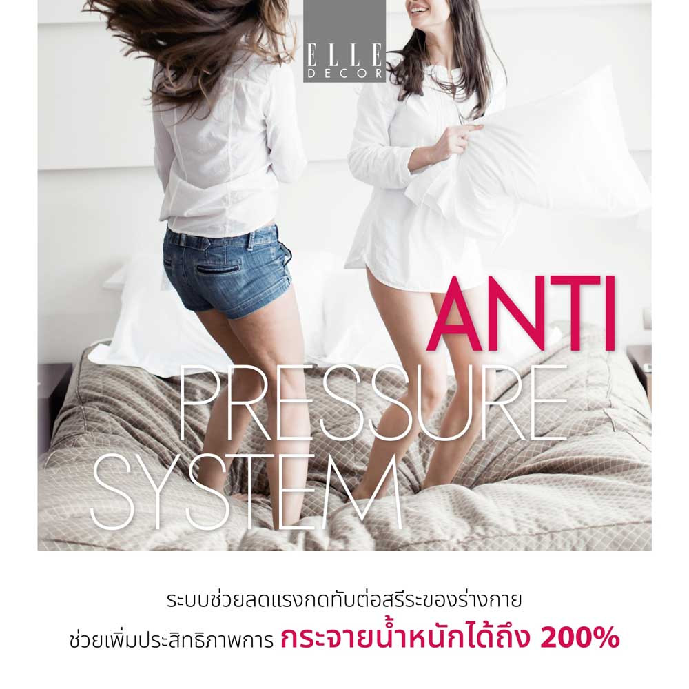 Anti-Pressure System: ระบบช่วยลดแรงกดทับต่อสรีระของร่างกาย เทคนิคพิเศษเฉพาะที่นำ Relief Pad Topper ผสานเข้ากับเส้นใย Nano elle-fiber ช่วยเพิ่มประสิทธิภาพการกระจายน้ำหนักได้ถึง 200%