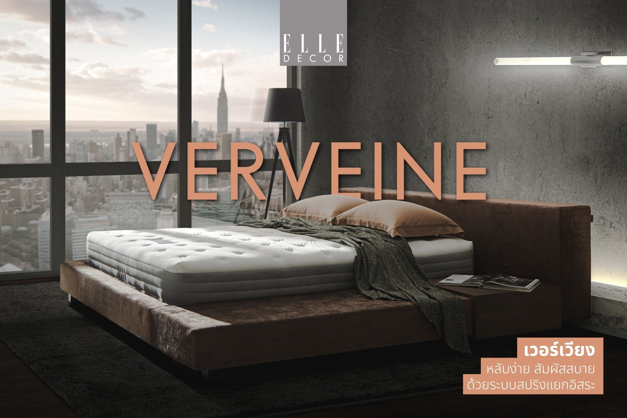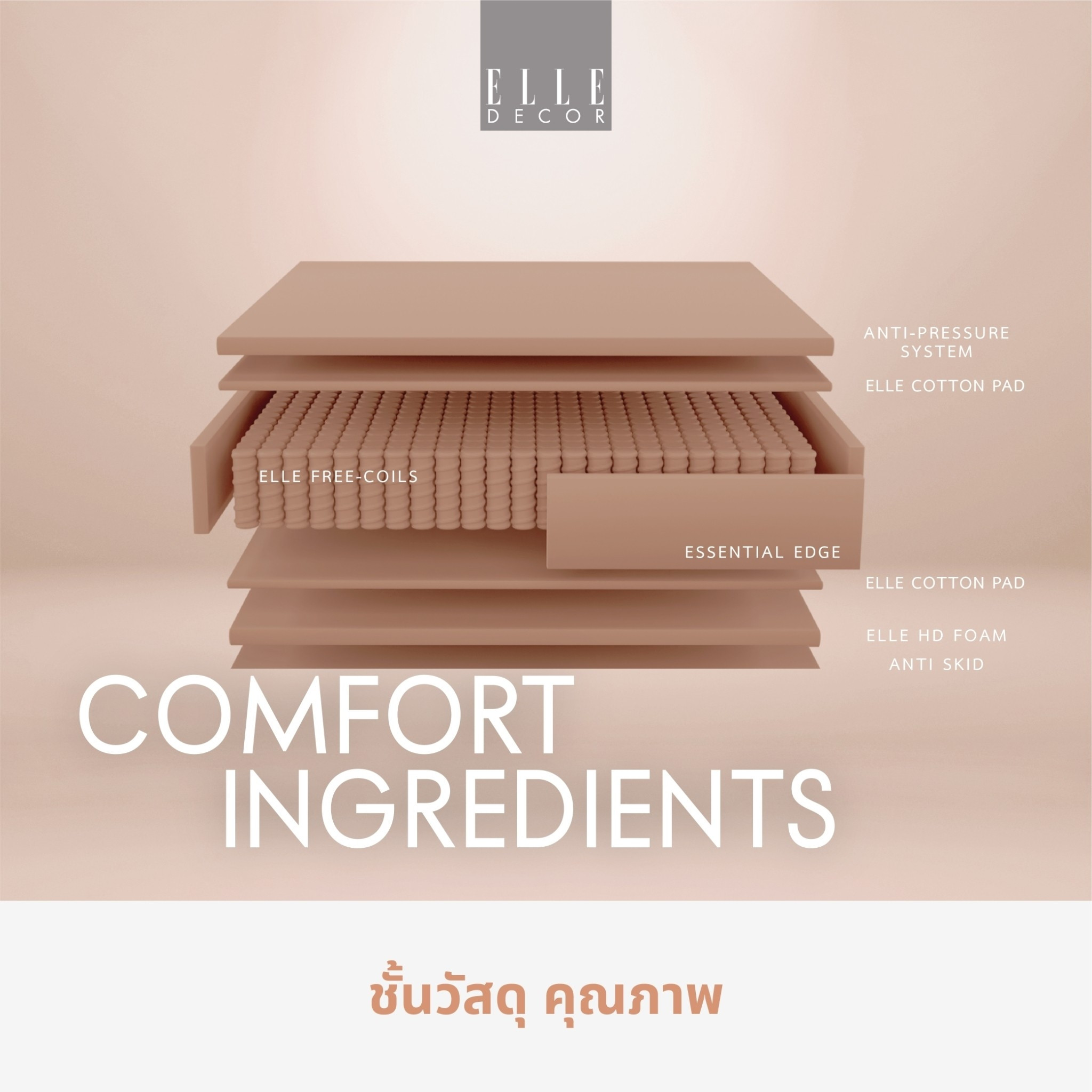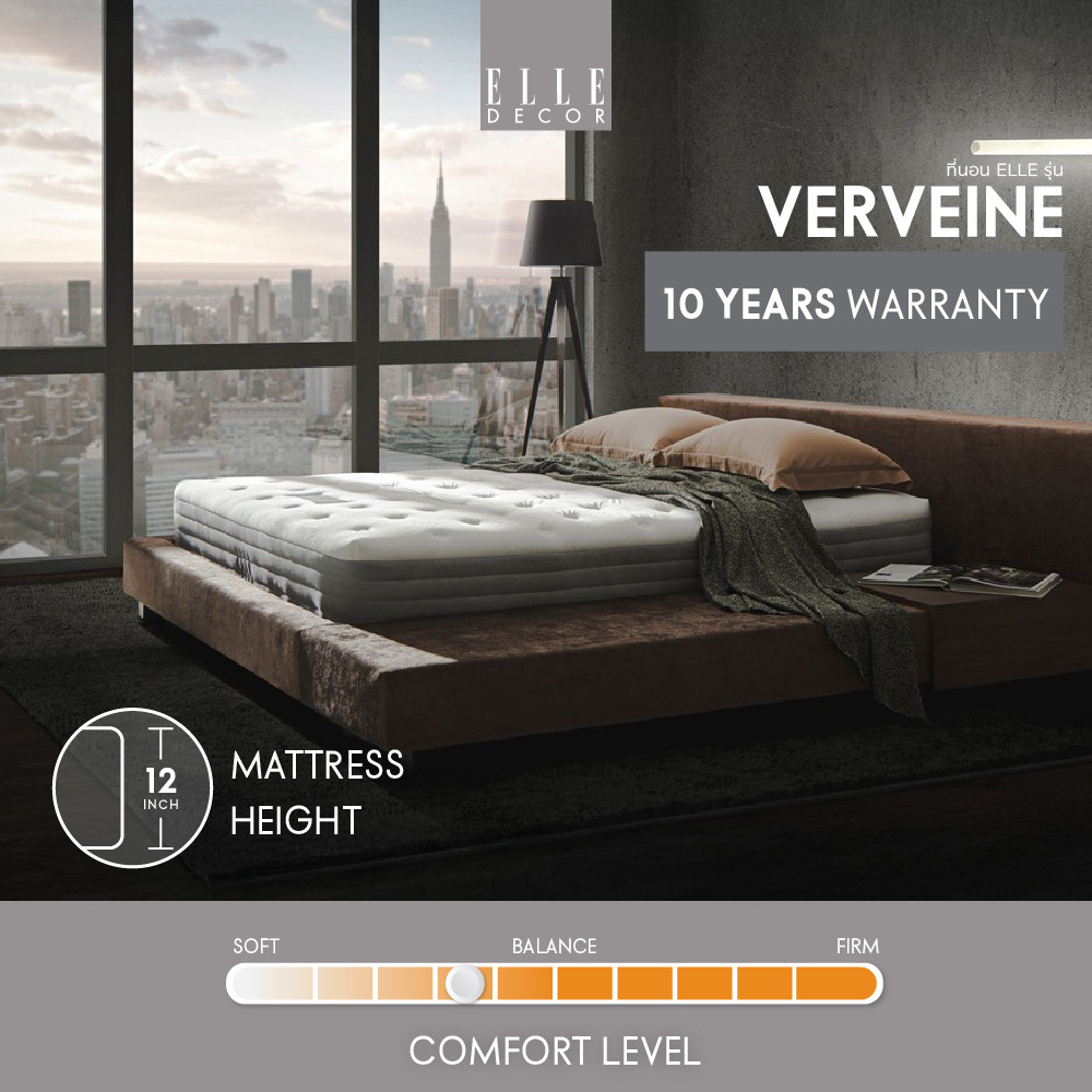 ช่วงเวลาแห่งการพักผ่อนไปพร้อมกับเสน่ห์แห่งไลฟ์สไตล์กับที่นอน ELLE รุ่น Verveine ด้วยระบบ Elle Free-Coils ระบบสปริงอิสระลิขสิทธ์เฉพาะจากประเทศฝรั่งเศส เสริมด้วย Elle HD Performance Foam แผ่นโฟมที่ให้ค่าสะท้อนสูงสัมผัสนุ่มแน่นช่วยในเรื่องการกระจายน้ำหนัก และช่วยเสริมการรองรับสรีระได้อย่างลงตัว Essential Edge โฟม Elle HD Performance Foam ถูกบุรอบขอบของโครงสร้างสปริงช่วยปกป้องที่นอนจากการเสียดสีของลูกสปริง