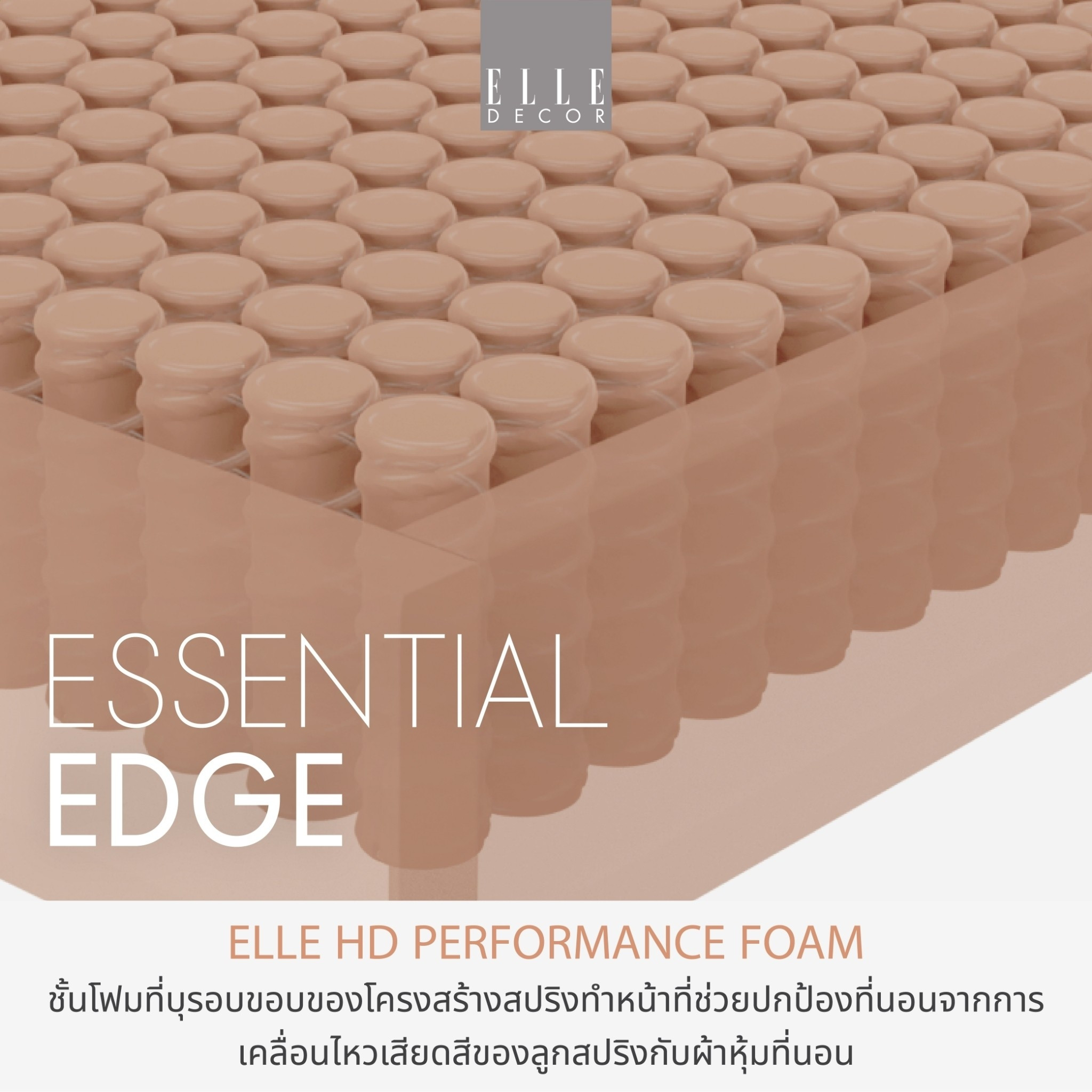 Essential Edge : โฟม Elle HD Performance Foam ที่ถูกบุรอบขอบของโครงสร้างสปริง ทำหน้าที่ช่วยปกป้องที่นอนจากการ เคลื่อนไหวเสียดสีของลูกสปริงกับผ้าหุ้มที่นอน ซึ่งจะทำให้ขอบของผ้าหุ้มที่นอนฉีกขาดเสียหายได้ อีกทั้งยังป้องกันฝุ่นละออง และสิ่งสกปรกต่างๆไม่ให้สามารถเข้ามาภายในที่นอน ซึ่งเป็นอีกหนึ่งสาเหตุของการ เกิดไรฝุ่น พร้อมระบบระบายอากาศ ที่หมุนเวียนอย่างมีประสิทธิภาพในทุกค่ำคืนที่ล้มตัวลงนอน