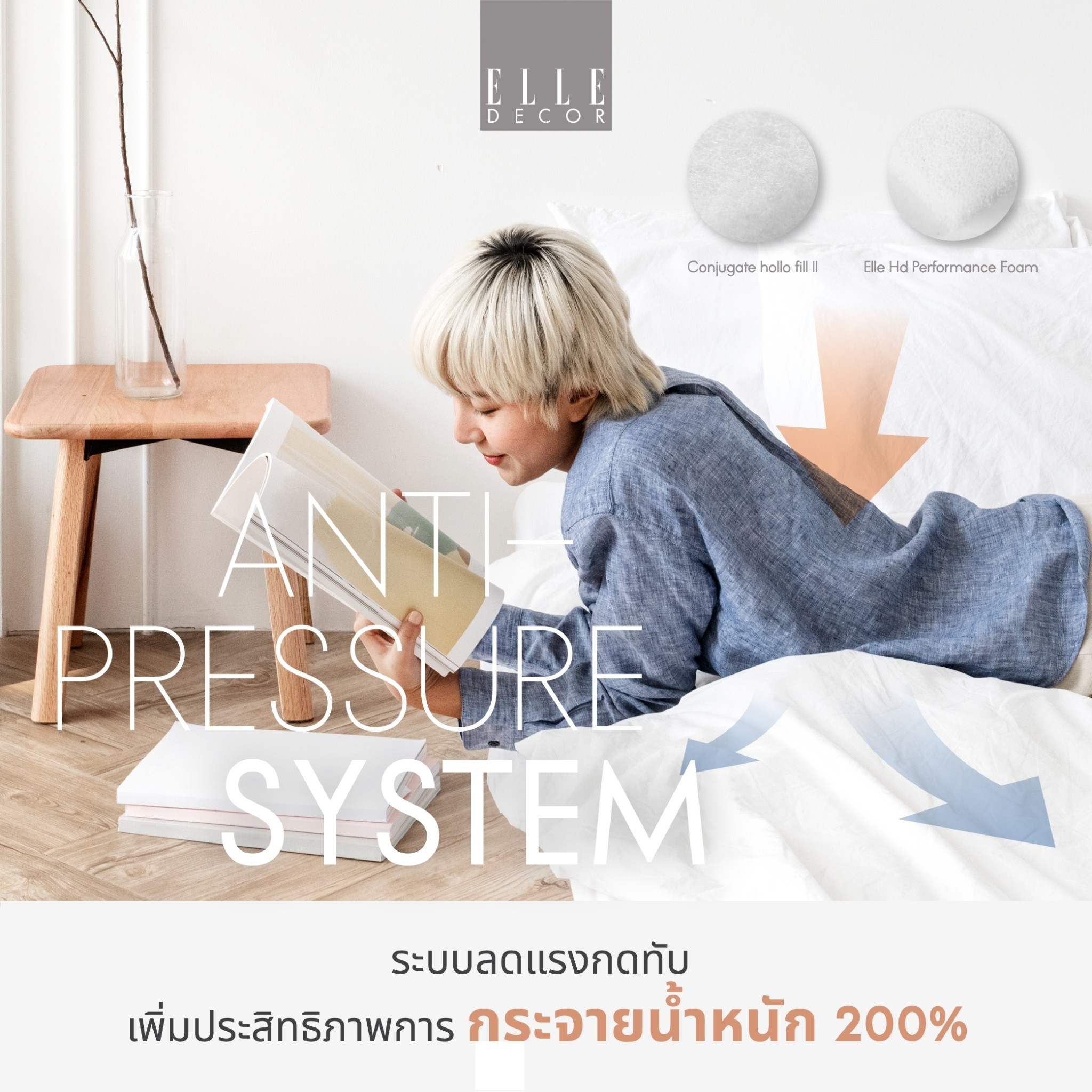 Anti-Pressure System : ระบบช่วยลดแรงกดทับต่อสรีระของร่างกาย เทคนิคพิเศษเฉพาะที่นำ Elle HD Performance Foam ผสานเข้ากับเส้นใย Conjugate hollo fill ll ช่วยเพิ่มประสิทธิภาพการกระจายน้ำหนักได้ถึง 200% ช่วยให้ระบบหมุนเวียนโลหิตคล่องตัว ลดอาการเหน็บชาและเมื่อยล้าตลอดทั้งค่ำคืนแห่งการพักผ่อน