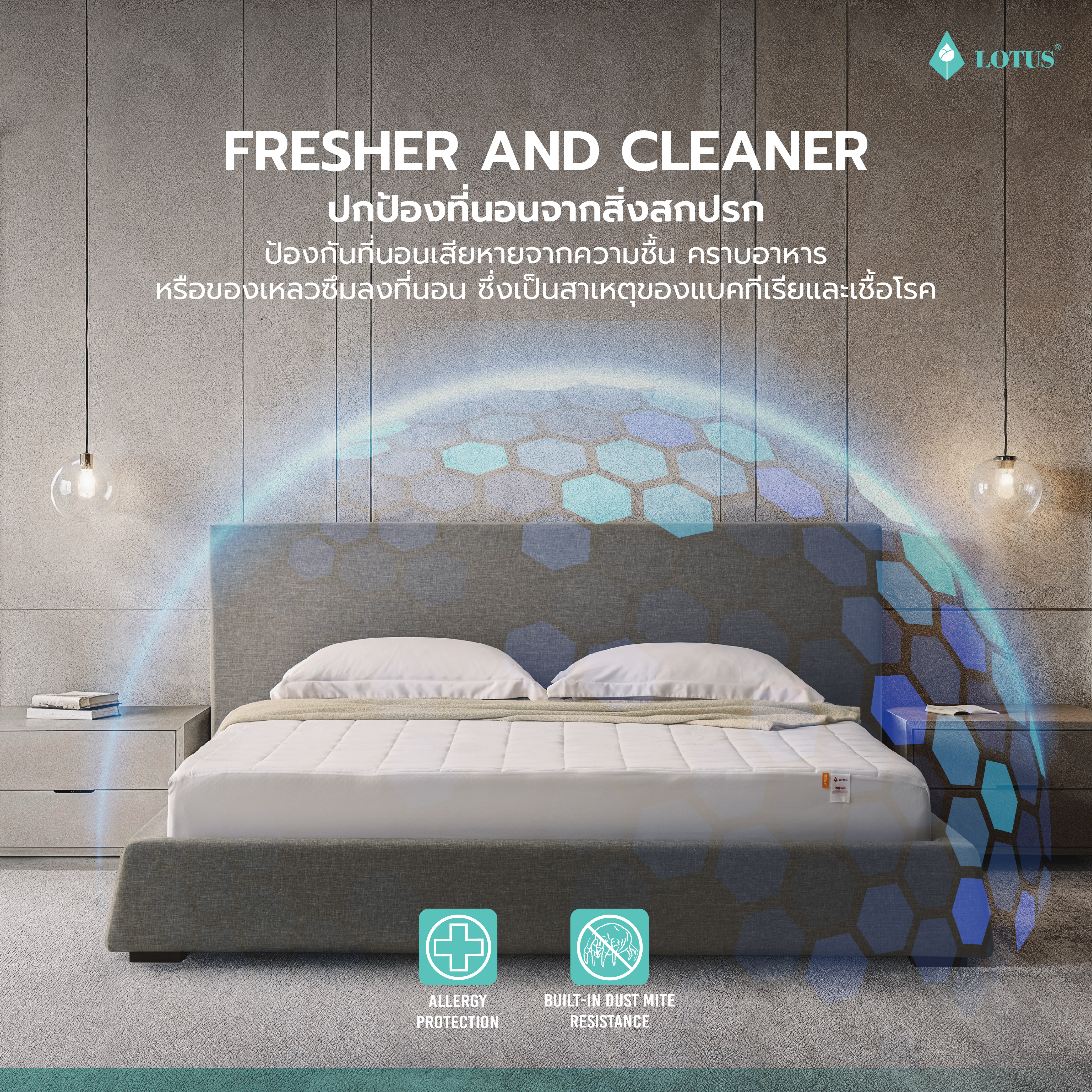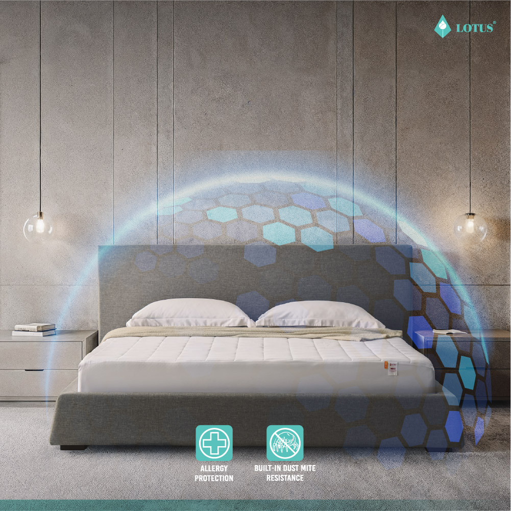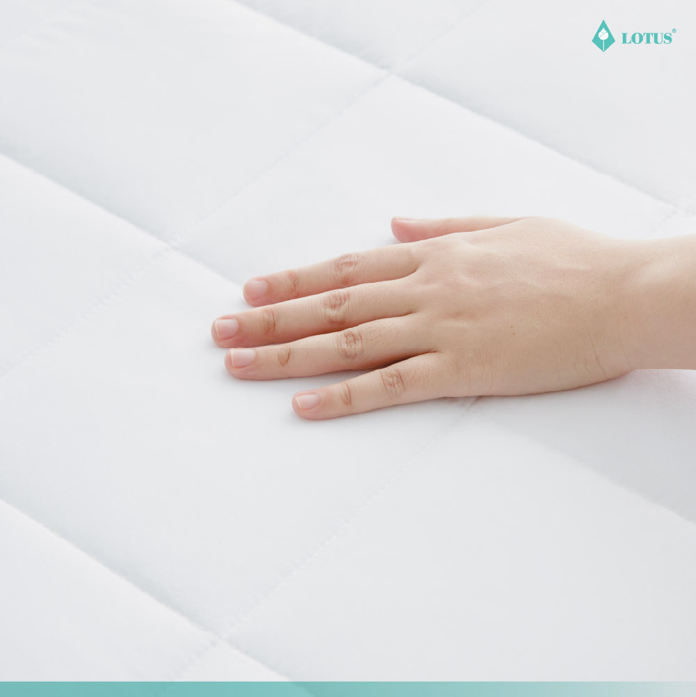ผ้ารองกันเปื้อน LOTUS Mattress Protector - Full Fit Perfect Sleep เสริมความสบายและปกป้องสุขอนามัยทุกการนอนหลับได้อย่างสมบูรณ์แบบ ด้วยดีไซน์ Full Fit ที่สวมง่ายเหมือนผ้าปูที่นอน สามารถปกป้องได้ทั้งพื้นผิวและขอบด้านข้างของที่นอน มาพร้อมคุณสมบัติป้องกันคราบสกปรก ความชื้น และลดการสะสมของเชื้อโรค ไรฝุ่น และสารก่อภูมิแพ้บนพื้นผิวที่นอนได้อย่างมีประสิทธิภาพ