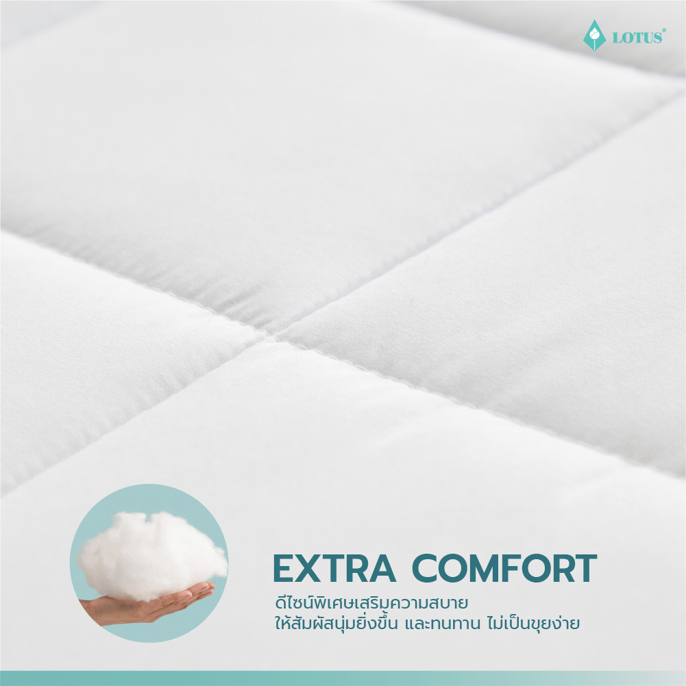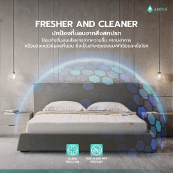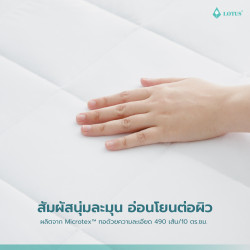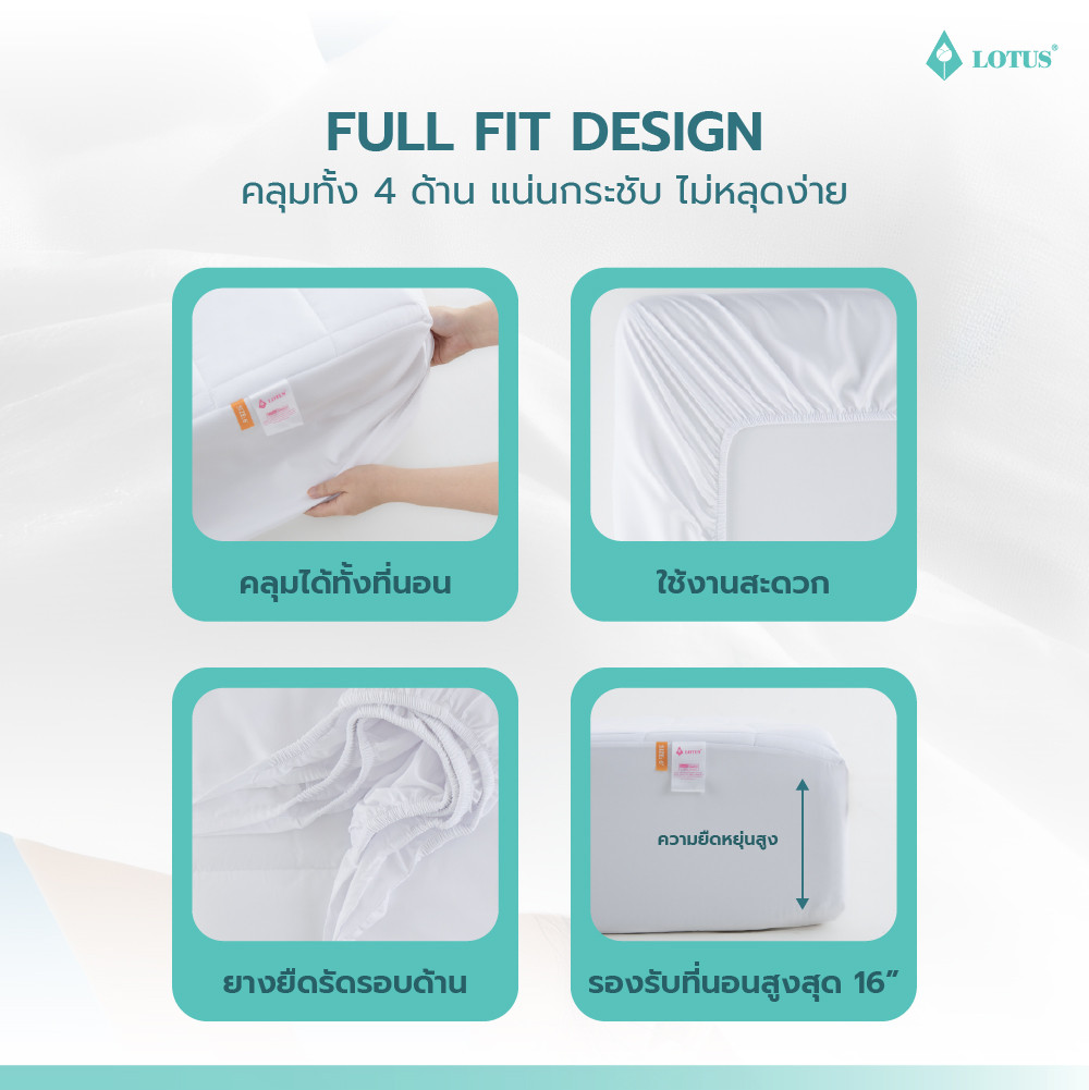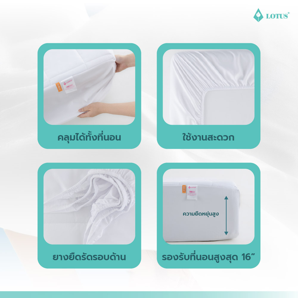ผ้ารองกันเปื้อน LOTUS Mattress Protector - Full Fit Perfect Sleep เสริมความสบายและปกป้องสุขอนามัยทุกการนอนหลับได้อย่างสมบูรณ์แบบ ด้วยดีไซน์ Full Fit ที่สวมง่ายเหมือนผ้าปูที่นอน สามารถปกป้องได้ทั้งพื้นผิวและขอบด้านข้างของที่นอน มาพร้อมคุณสมบัติป้องกันคราบสกปรก ความชื้น และลดการสะสมของเชื้อโรค ไรฝุ่น และสารก่อภูมิแพ้บนพื้นผิวที่นอนได้อย่างมีประสิทธิภาพ ผลิตจากผ้า MicrotexTM ความละเอียด 490 เส้น/10 ตร.ซม. มอบผิวสัมผัสนุ่มละมุน อ่อนโยนต่อผิว ไม่ก่อให้เกิดการระคายเคืองและอาการแพ้ เหมาะกับผู้ที่ผิวแพ้ง่าย เสริมด้วยระบบ Airflow ระบายอากาศแบบพิเศษ ช่วยลดความอับชื้นสะสม และถ่ายเทความร้อนได้ดีเยี่ยม เพิ่มความเย็นสบายขณะนอนหลับ ทั้งยังเพิ่มอายุการใช้งานของที่นอน คงความสะอาดเหมือนใหม่อยู่เสมอ และสามารถถอดซักทำความสะอาดได้ง่าย เพื่อความสะอาดและสุขอนามัยที่ดีในทุกคืนของการพักผ่อน