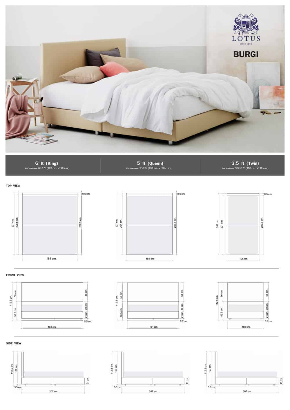 เตียงนอน รุ่น Burgi จาก LOTUS มาพร้อมความพิเศษ ผสมผสานความงดงามร่วมสมัยเข้ากับไลฟ์สไลต์ที่ทันสมัย ชุดหัวเตียงและฐานรอง Lotus Burgi พร้อมตอบสนองในทุกๆส่วนของความต้อง มีทั้งหมด 3 ขนาด ได้แก่ 3.5 ฟุต, 5 ฟุต, 6 ฟุต หลับสบายกับ LOTUS MATTRESS