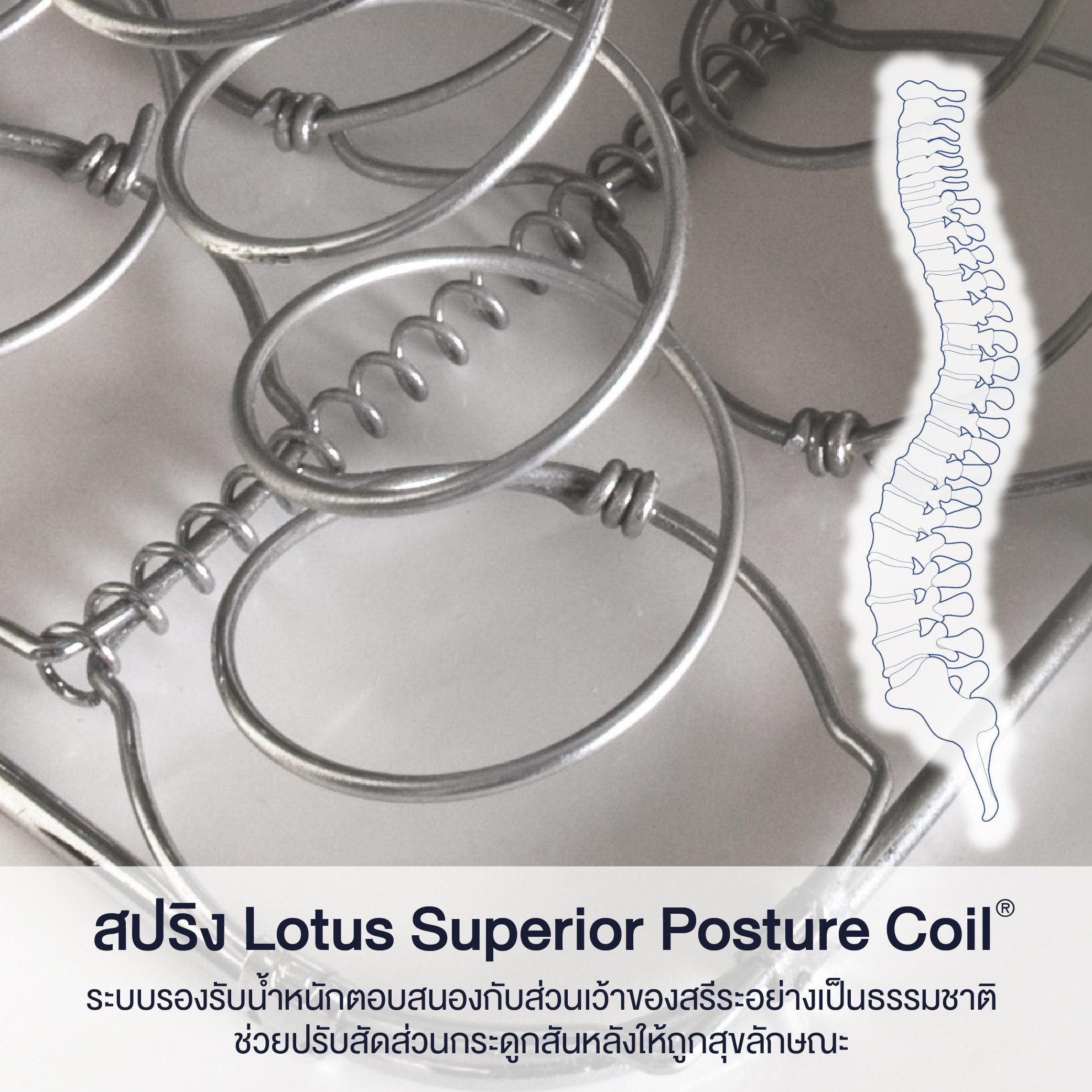 - สปริง LOTUS Superior Posture Coil® ระบบการรองรับน้ำหนักที่ถูกออกแบบให้มีหน้าผิวสัมผัสทรงเหลี่ยมที่ตอบสนองกับส่วนโค้งเว้าของสรีระอย่างเป็นธรรมชาติและนุ่มนวล แต่แฝงไปด้วยความแข็งแรงของโครงสร้างสปริงที่มาพร้อมกับ การขดลวดขดถึง 6 Turn ช่วยในการปรับสัดส่วน กระดูกสันหลังให้ถูกสุขลักษณะและไม่หย่อนเป็นท้องช้างซึ่งเป็นหนึ่งในสาเหตุหลักของอาการปวดหลังเรื้อรัง.