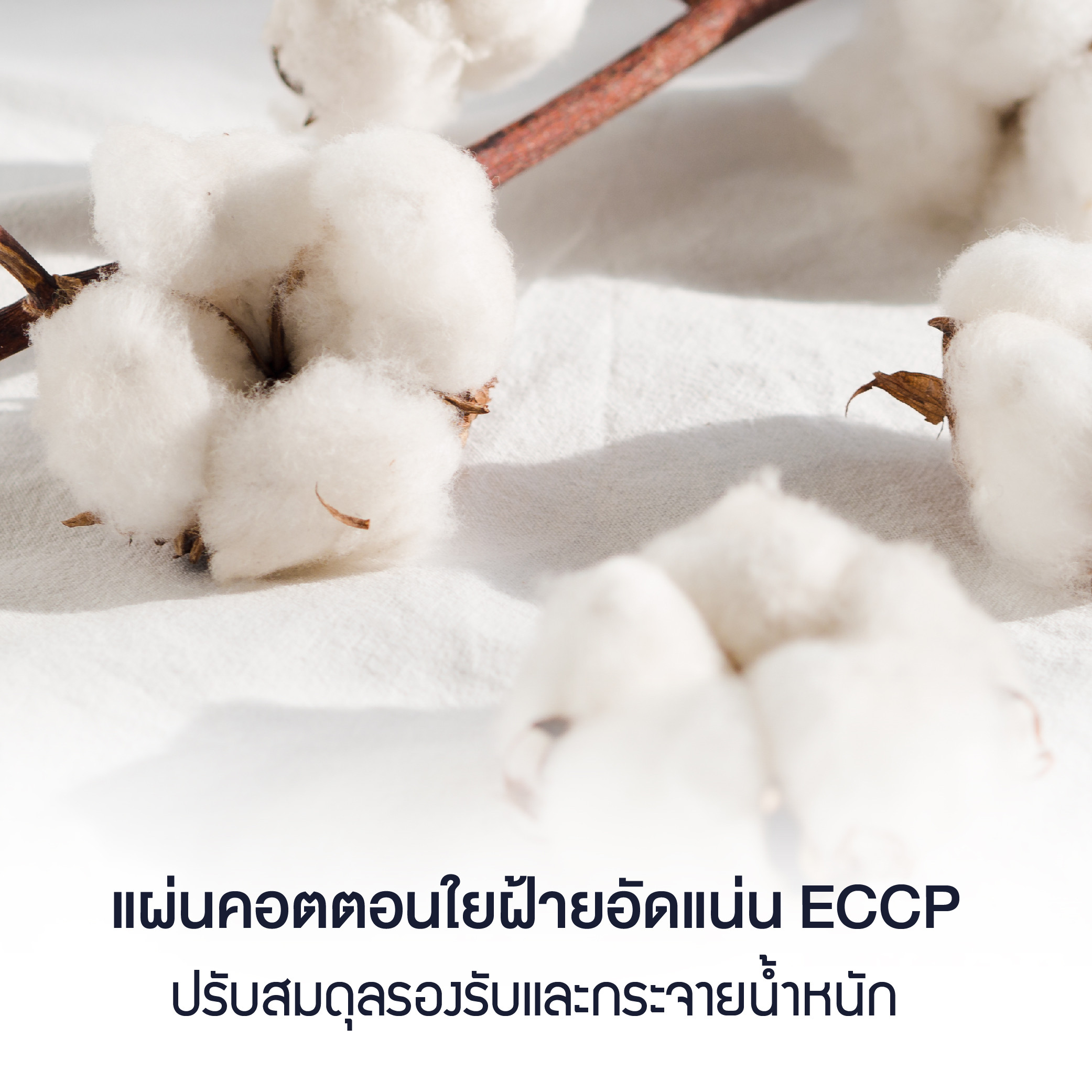 - แผ่นคอตตอนใยฝ้ายอัดแน่น ECCP (25 มิลลิเมตร) เสริมบนระบบสปริงรองรับน้ำหนัก เพื่อช่วยเสริมความแข็งแรง แต่คงไว้ซึ่งความนุ่มนวลในทุกการเคลื่อนไหวของลูกสปริง.