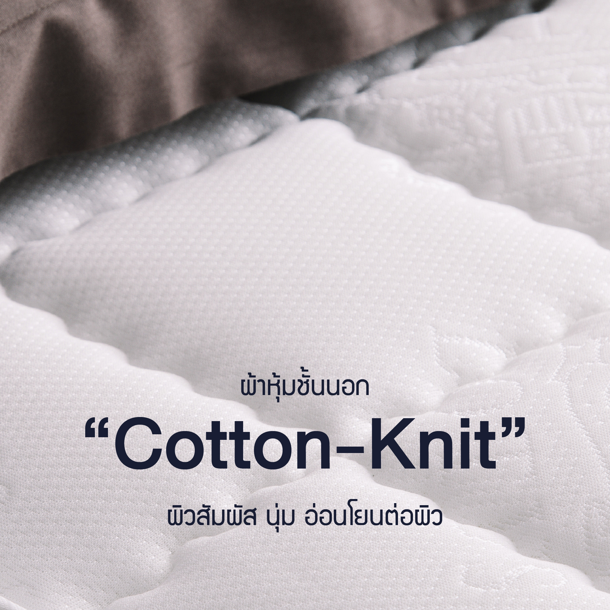 - Cotton Knit ผ้าหุ้มสัมผัสเนียนนุ่ม ไม่ระคายเคืองผิวพรรณ มาพร้อมคุณสมบัติระบายอากาศ มอบความเย็นสบาย และยับยั้งการสะสมของไรฝุ่นและแบคทีเรีย