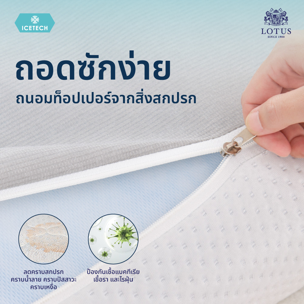 มอบความเย็นสบายด้วย ICETECH knit fabric ผ้าหุ้มที่ผสานเจลเย็นลงในเส้นใย จึงทำให้สัมผัสถึงความเย็นที่ยิ่งกว่าผ้าหุ้มทั่วไป ช่วยปรับอุณหภูมิร่างกายให้เหมาะสมแก่การนอน และช่วยลดความอับชื้น ให้คุณนอนหลับสนิทต่อเนื่องยาวนานเพื่อการมีสุขภาพที่ดีขึ้น