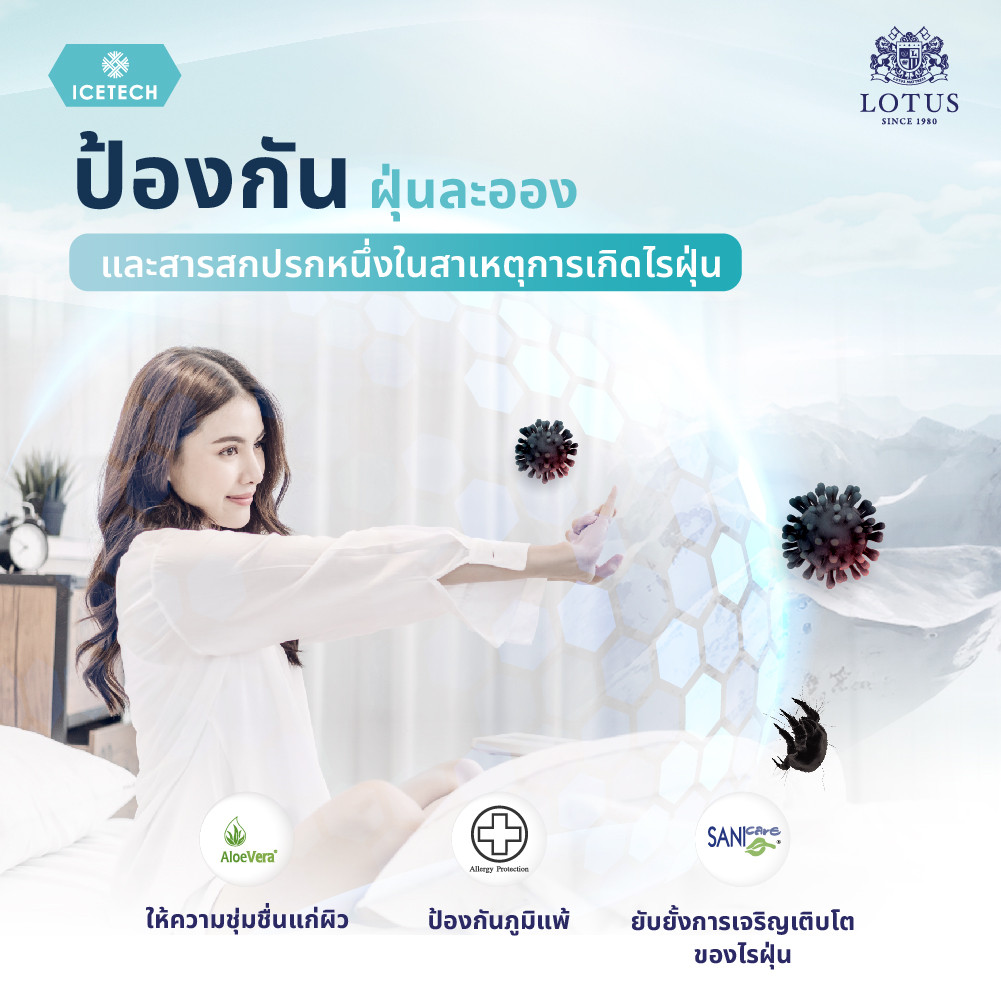 - Balance & Cooling Base : ฐานโฟมที่เสริมความนุ่มสบายและมีความยืดหยุ่นที่ดีเยี่ยม ให้คุณสัมผัสการนอนไร้แรงกดทับไปพร้อมกับการฟื้นฟูสุขภาพผ่านการรองรับทุกสัดส่วนอย่างสมดุล ลดอาการปวดเมื่อยที่สะสมมานาน และผ่านการผลิตด้วยเทคโนโลยีเฉพาะของ LOTUS ที่ช่วยสร้างคุณสมบัติความเย็นให้กับเนื้อโฟม มอบสัมผัสเย็นสบายมากยิ่งขึ้น ช่วยลดการขับเหงื่อยามนอนหลับ ทั้งยังเพิ่มประสิทธิภาพในการระบายอากาศเพื่อมอบความปลอดโปร่งที่ไร้ความอับชื้นให้ช่วงเวลาพักผ่อน และป้องกันการสะสมของไรฝุ่นและแบคทีเรียภายในโครงสร้างของที่นอน ให้คุณรู้สึกได้ถึงความผ่อนคลายอย่างสมบูรณ์แบบ