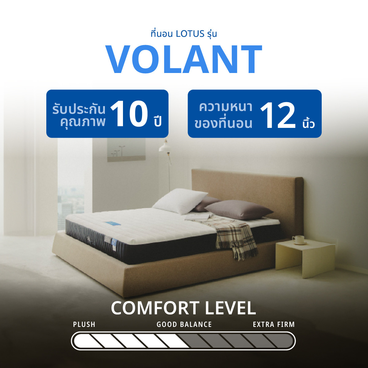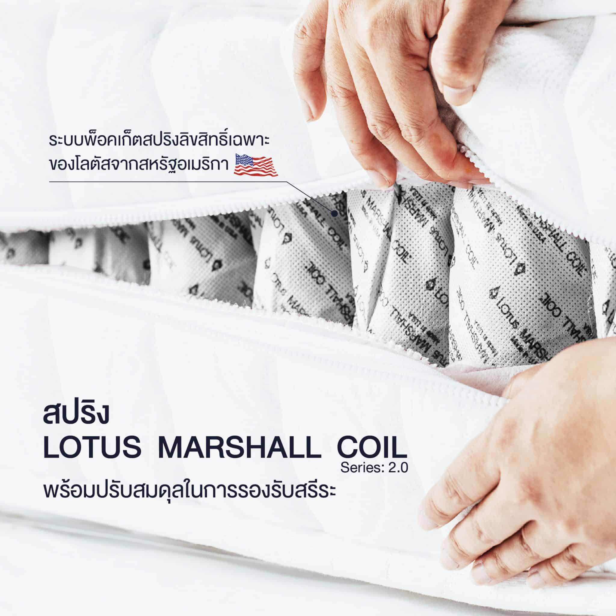 ที่นอนรุ่น Volant จาก LOTUS พิเศษกว่าด้วย LOTUS MARSHALL COIL® Series: Micro Pocket 2.0 ลิขสิทธิ์เฉพาะของโลตัสจากสหรัฐอเมริกา เพิ่มจำนวนลูกสปริงขึ้นถึง 40% ทำงานแบบแยกอิสระทำให้ขจัดปัญหาการสั่นไหวรบกวนคนข้างเคียง เพิ่มความเป็นธรรมชาติในการรองรับน้ำหนัก และความแน่นของผิวสัมผัส อีกทั้งดีไซน์ที่ยังคงไว้ซึ่งความเรียบง่ายสไตล์มินิมอลแต่แฝงไว้ด้วยพลังแห่งความสบายอย่างเต็มเปี่ยมมีสินค้า 3 ขนาด 3.5 ฟุต, 5 ฟุต, 6 ฟุต ที่นอนหลับสบายพร้อมรับประกัน 10 ปี