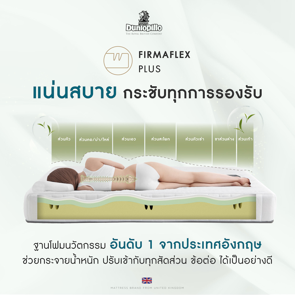 Firma Flex Plus ฐานโฟมวิทยาศาสตร์ที่ผ่านกระบวนการขึ้นรูปแบบพิเศษเพื่อให้ตัวโฟมมีสัมผัสที่นุ่มแน่นกำลังดี เหมาะสมกับผู้นอนทุกสรีระ สามารถลดแรงกดทับและกระจายน้ำหนักจากร่างกายไปสู่ที่นอนได้อย่างดีเยี่ยม เสริมช่องระบายอากาศ ในตัวโฟมเพื่อการระบายอากาศที่ดีที่สุด