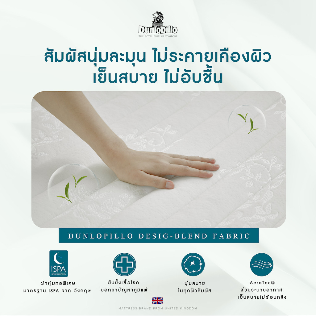 ผ้าหุ้ม Dunlopillo Design Cotton – Blend Fabric นำเข้าจากประเทศอังกฤษ สามารถระบายอากาศได้ดี และสร้างความสบายในทุกผิวสัมผัส