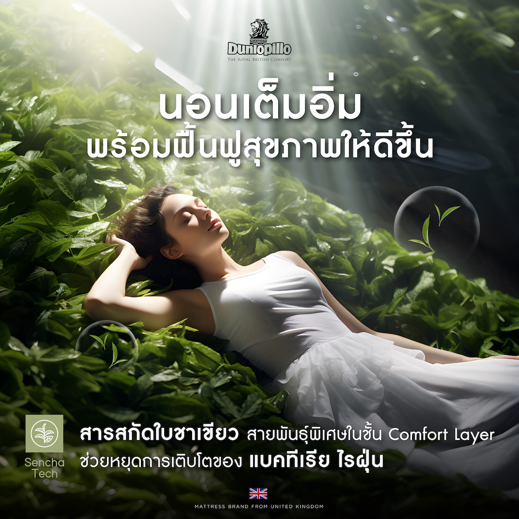 Sencha Tech ด้วยคุณสมบัติพิเศษของชาเขียวที่สามารถต้านจุลชีพตามธรรมชาติและต่อสู้กับแบคทีเรีย เชื้อรา และจุลินทรีย์ ทำให้ช่วยลดกลิ่นไม่พึงประสงค์และความอับชื้นของที่นอนได้อย่างมีประสิทธิภาพ ช่วยให้ผ่อนคลาย นอนหลับสนิทมากขึ้น เสริมให้การนอนหลับของคุณเต็มไปด้วยสุขอนามัยอย่างเต็มเปี่ยม