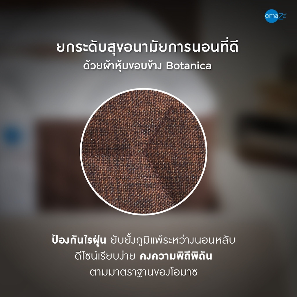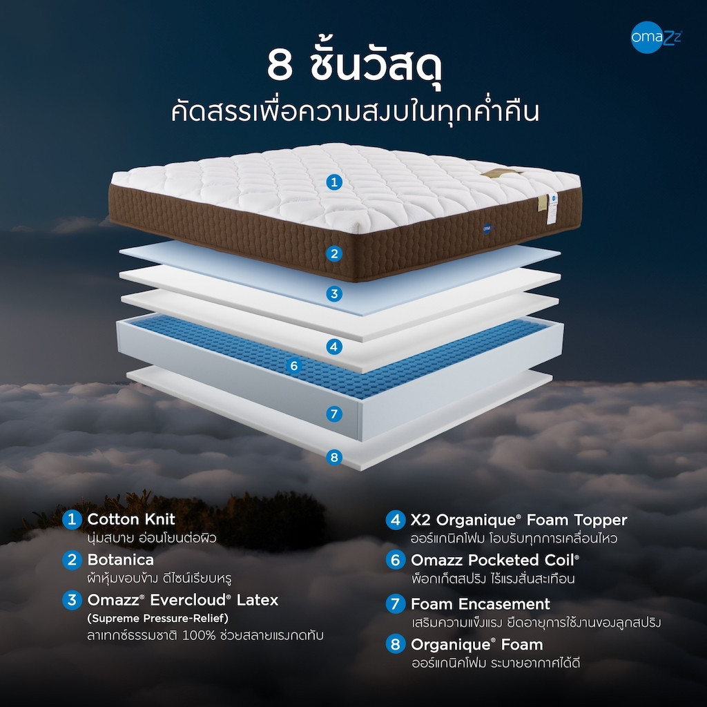 ผ้าหุ้ม : ผ้าหุ้มคอตตอน Knit เคลือบสาร Sanicott สารสกัดจากธรรมชาติ Sanicott พร้อมผสมผสานกับแผ่นโฟมลาเทกซ์ธรรมชาติโอมาซทาลาเทกซ์ รุ่น Evercloud® ที่มีคุณสมบัติที่โดดเด่นช่วยในการสลายจุดกดทับของร่างกายได้ถึง 100% ผ้าหุ้มชั้นนอก : Botanica คลาสสิกด้วยการออกแบบที่เรียบง่าย ถักทอลายผ้าอย่างประณีตและพิถีพิถัน พร้อมคุณสมบัติป้องกันไรฝุ่น ความสูง : 13 นิ้ว รับประกัน : 15 ปี |