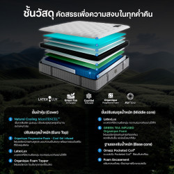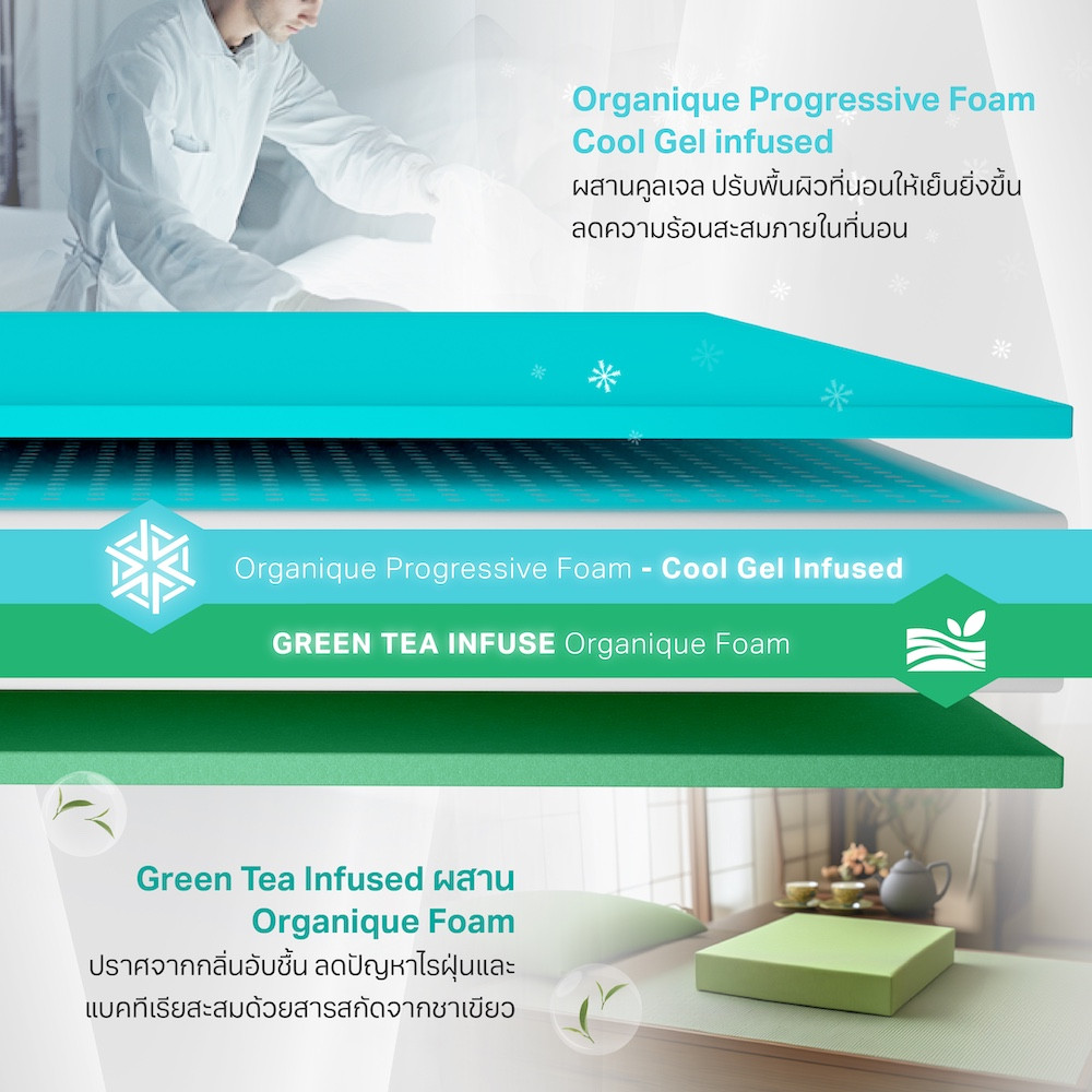 ยกระดับความสบายตลอดการพักผ่อนกับชั้น Euro Top ที่เสริมความเย็น เพื่อมอบการพักผ่อนที่เย็นสบายและนุ่มนวลกับชั้น Organique Progressive Foam - Cool Gel Infused ปรับลดอุณหภูมิบนพื้นผิวที่นอน เพื่อมอบสัมผัสเย็นอย่างต่อเนื่อง และนุ่มนวลเหนือชั้นด้วย LatexLux และ Organique Foam Topper ช่วยผ่อนคลายแรงกดทับและรองรับสรีระร่างกายได้อย่างลงตัว ให้ทุกค่ำคืนเย็นสดชื่นทุกสัมผัสกับ Cooling Fabric นวัตกรรมความเย็นภายในหุ้ม เพิ่มสัมผัสเย็น และช่วยปรับสมดุลอุณหภูมิร่ายกายขณะนอนหลับ ทั้งยังมีคุณสมบัติการระบายอากาศ มอบความรู้สึกสดชื่นและผ่อนคลายทุกชั่วโมงแห่งการพักผ่อน