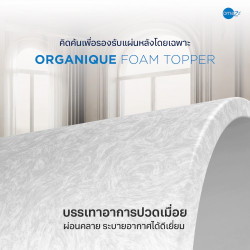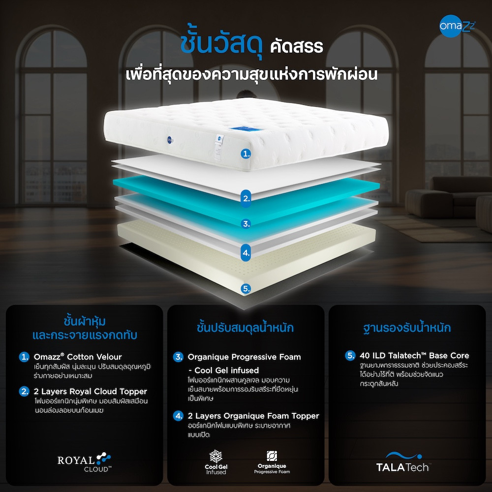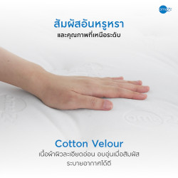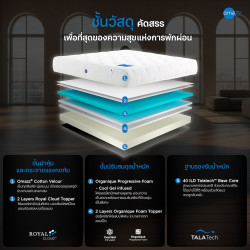 สัมผัสความเย็นสบายอย่างเป็นเลิศด้วยการเสริมชั้น Organique Progressive Foam - Cool Gel Infused ช่วยสลายแรงกดทับ และปรับอุณหภูมิพื้นผิวให้เย็นยิ่งขึ้น พร้อมชั้น Royal Cloud Topper ยกระดับการรองรับสรีระอย่างนุ่มนวลดุจล่องลอยบนปุยเมฆ และมีโครงสร้าง Opened-cell ช่วยระบายความชื้นได้ดี เพื่อสัมผัสที่แห้งสนิทและเย็นสบายตลอดคืน ทั้งยังเสริมความนุ่มละมุนด้วยผ้าหุ้ม Cotton Velour เส้นใยคุณภาพสูงที่ผ่านการถักทออย่างประณีต มอบสัมผัสที่อบอุ่นและนุ่มคล้ายขนแกะ เติมเต็มความสุขและการพักผ่อนทุกค่ำคืนของคุณให้เข้าสู่ภวังค์อย่างแท้จริง